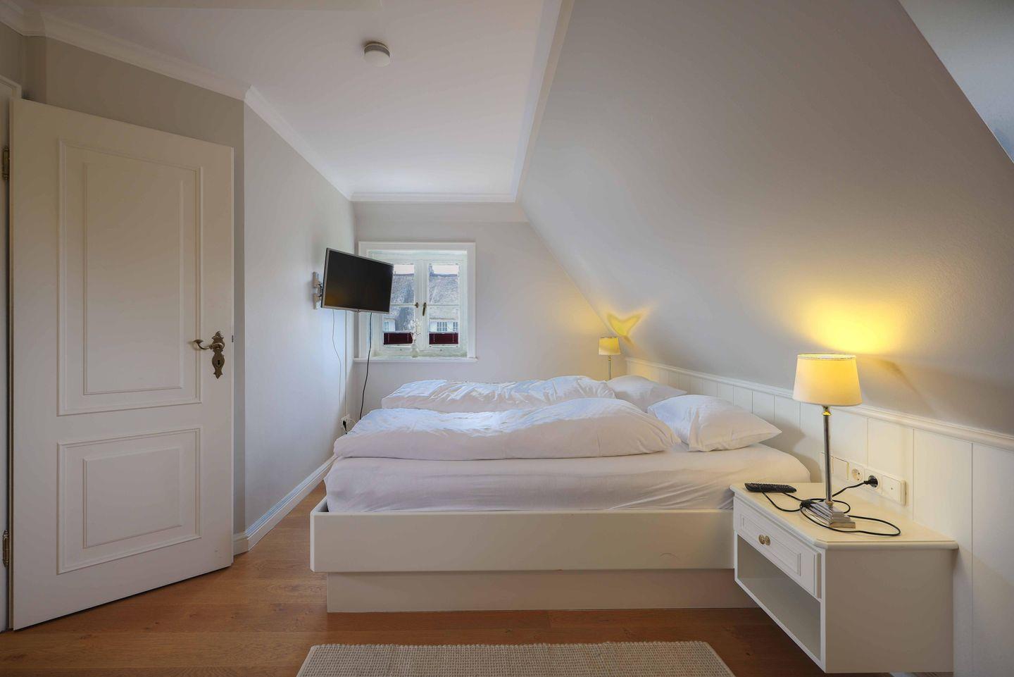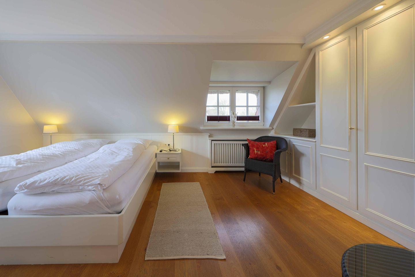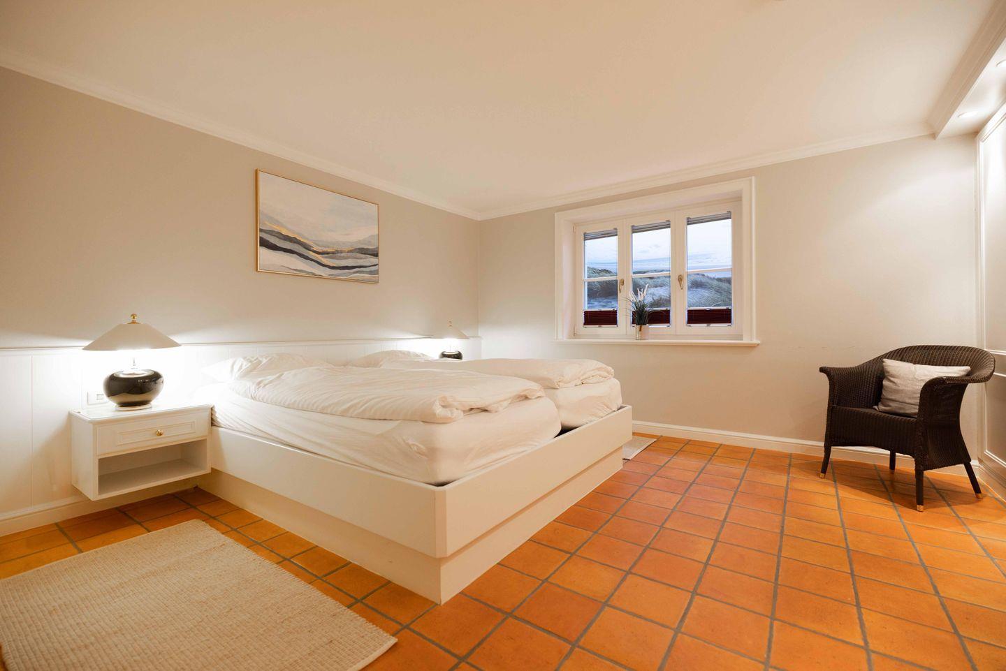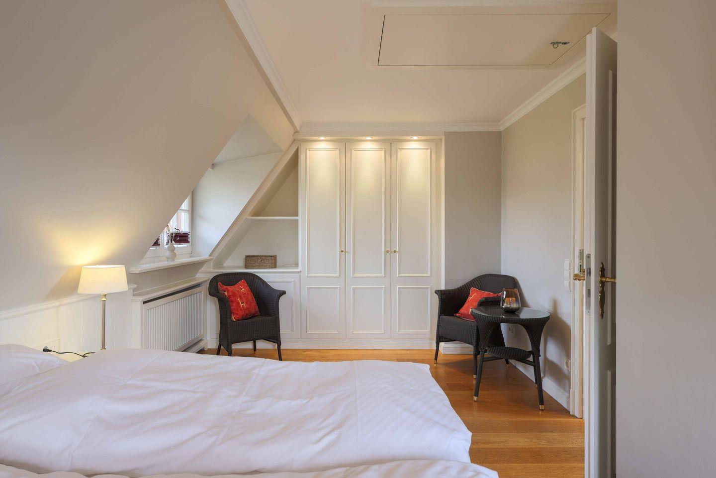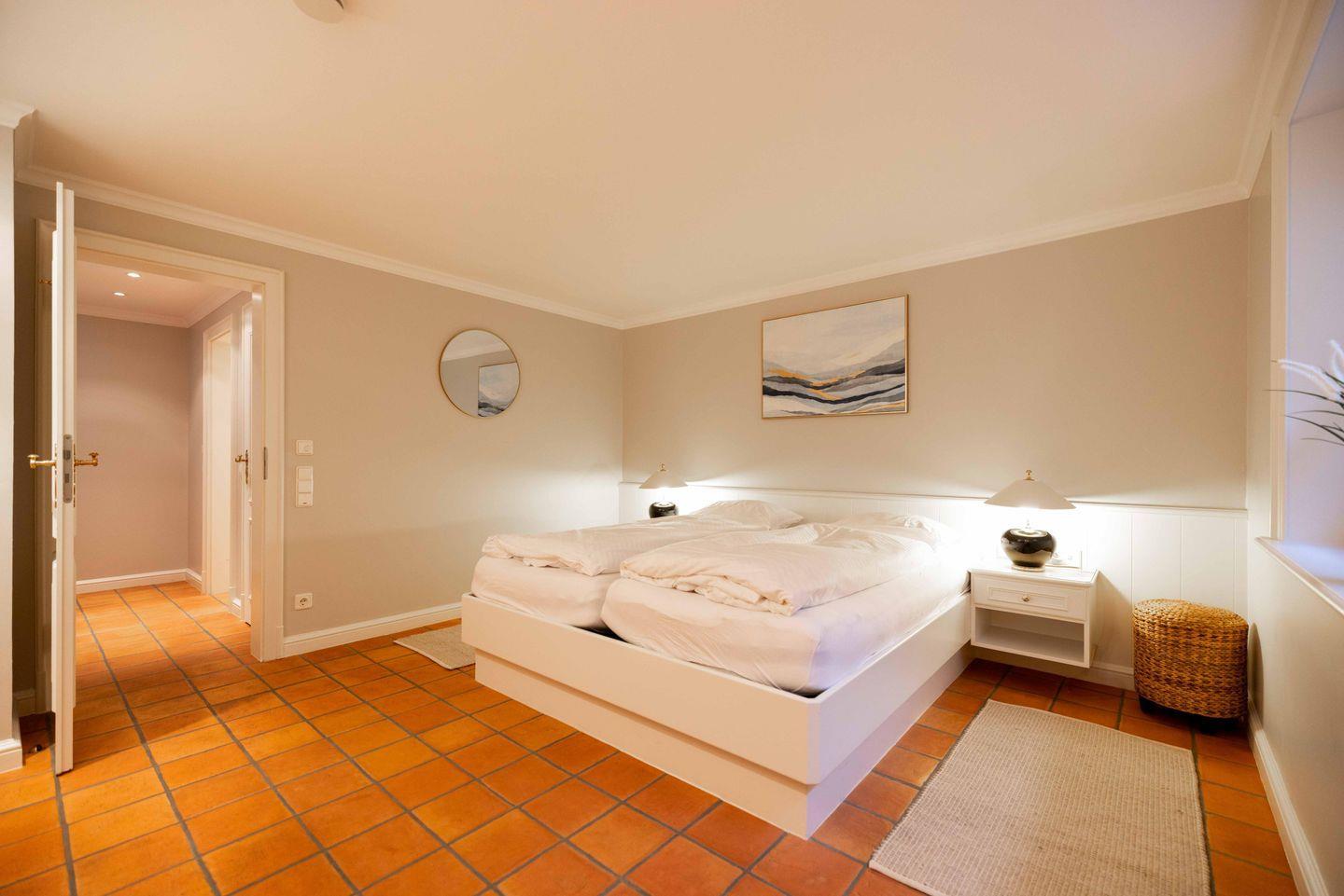 Die Schlafzimmer liegen im Unter- und Obergeschoss und verfügen jeweils über ein eigenes Badezimmer. Beide Räume sind mit großen Doppelbetten (200x200cm), Fernseher und Kleiderschränken möbliert. Zusätzliche Sitzmöglichkeiten sind ebenfalls vorhanden. Im oberen Schlafzimmer lassen sich darüber hinaus Wertgegenstände im Safe sicher verwahren.