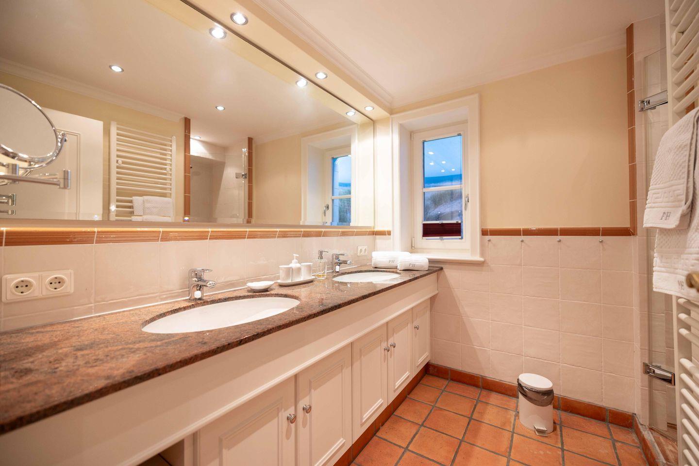Beide Badezimmer sind hell gefliest und modern ausgestattet. Das Badezimmer im Obergeschoss verfügt über eine bodengleiche Dusche und einen großzügig angelegten Waschtisch mit Spiegel. Handtücher, Badetücher und Bademantel sind ebenso vorhanden wie ein Föhn und ein Kosmetikspiegel. Die Fußbodenheizung sorgt für eine angenehme Wärme. Das untere Bad ist gleichwertig ausgestattet, zusätzlich bietet ein Doppelwaschtisch weiteren Platz.