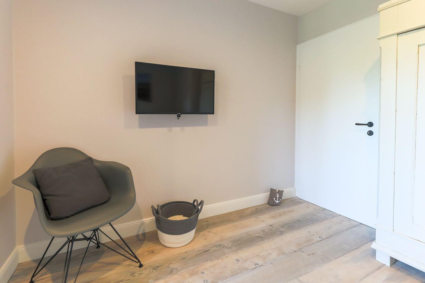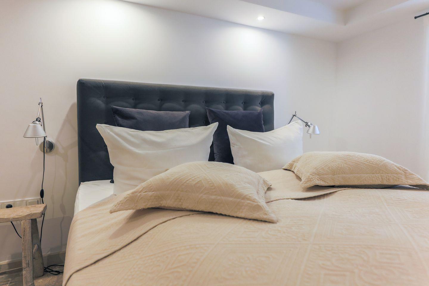 Zurück im Haus greifen die insgesamt drei Schlafzimmer (zwei im Obergeschoss, eins im Souterrain) das Interior-Konzept wieder nahtlos auf: Ganz viel Weiß, komfortable Betten und raffinierte Details schaffen hier eine entspannte Atmosphäre.