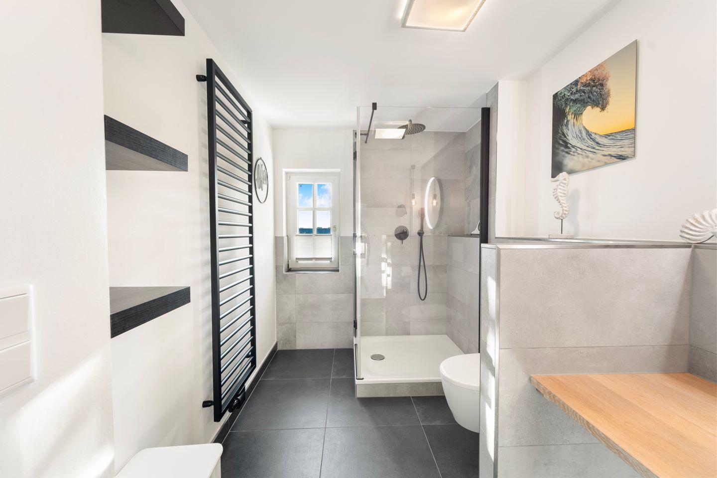 Das moderne Badezimmer mit bodengleicher Dusche und WC befindet sich auf der ersten Ebene und ist ein komfortabler Rückzugsort.
