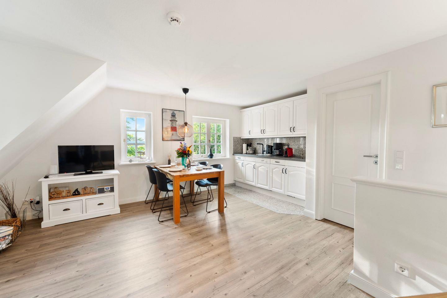 Das einladende Wohnzimmer ist mit einer gemütlichen Sofaecke und einem offenen Küchen-Essbereich ausgestattet, perfekt für entspannende Stunden. Die großen Fenster bieten einen herrlichen Blick, um die Sylter Landschaft oder den Sonnenuntergang zu genießen. Für Familien mit kleinen Kindern ist ein Kinderhochstuhl vorhanden.