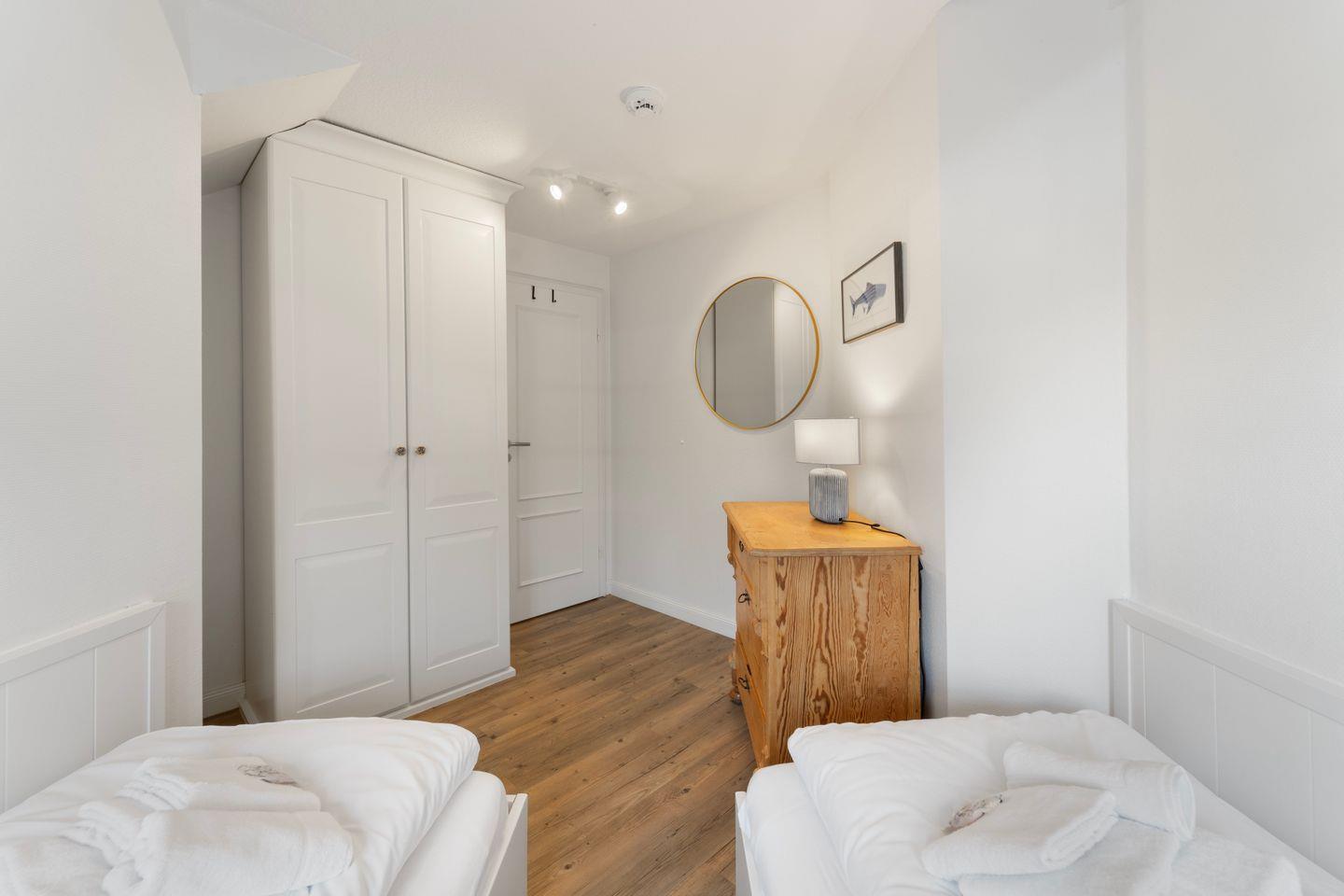 Auf der ersten Ebene befindet sich ein Schlafzimmer mit zwei Einzelbetten (90x200 cm) und einer großzügigen Raumhöhe. Über eine Treppe erreichen Sie das zweite Schlafzimmer im Dachgeschoss, das mit einem Doppelbett (2x 90x200 cm) ausgestattet ist. Hier befindet sich eine großzügige Abseite, die als Stauraum für Kleidung und Koffer dient.
