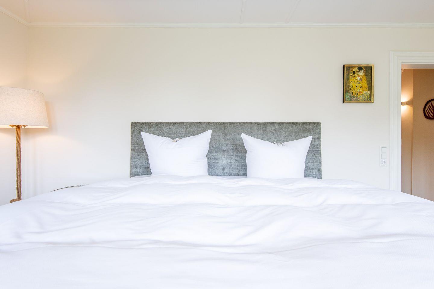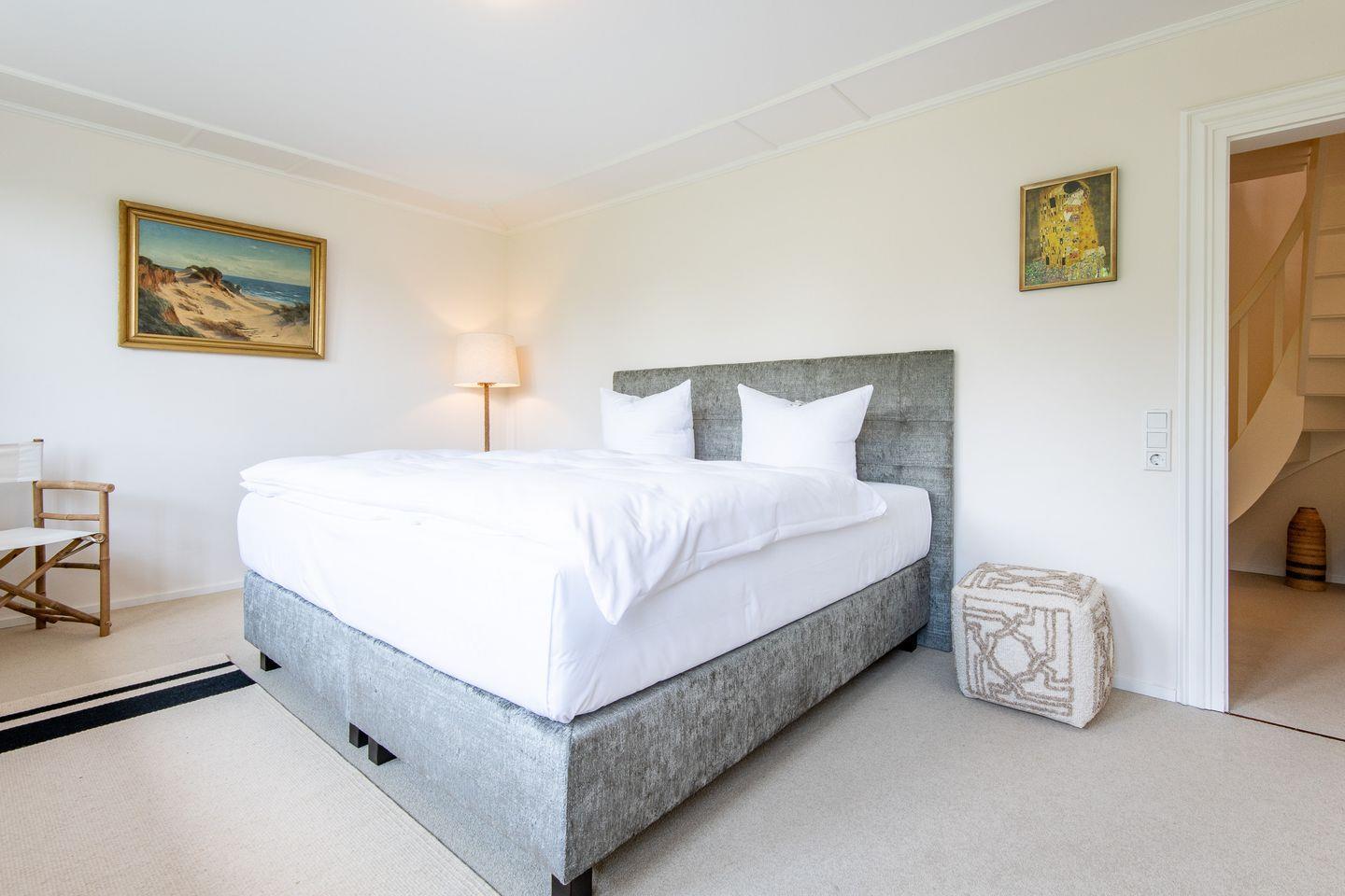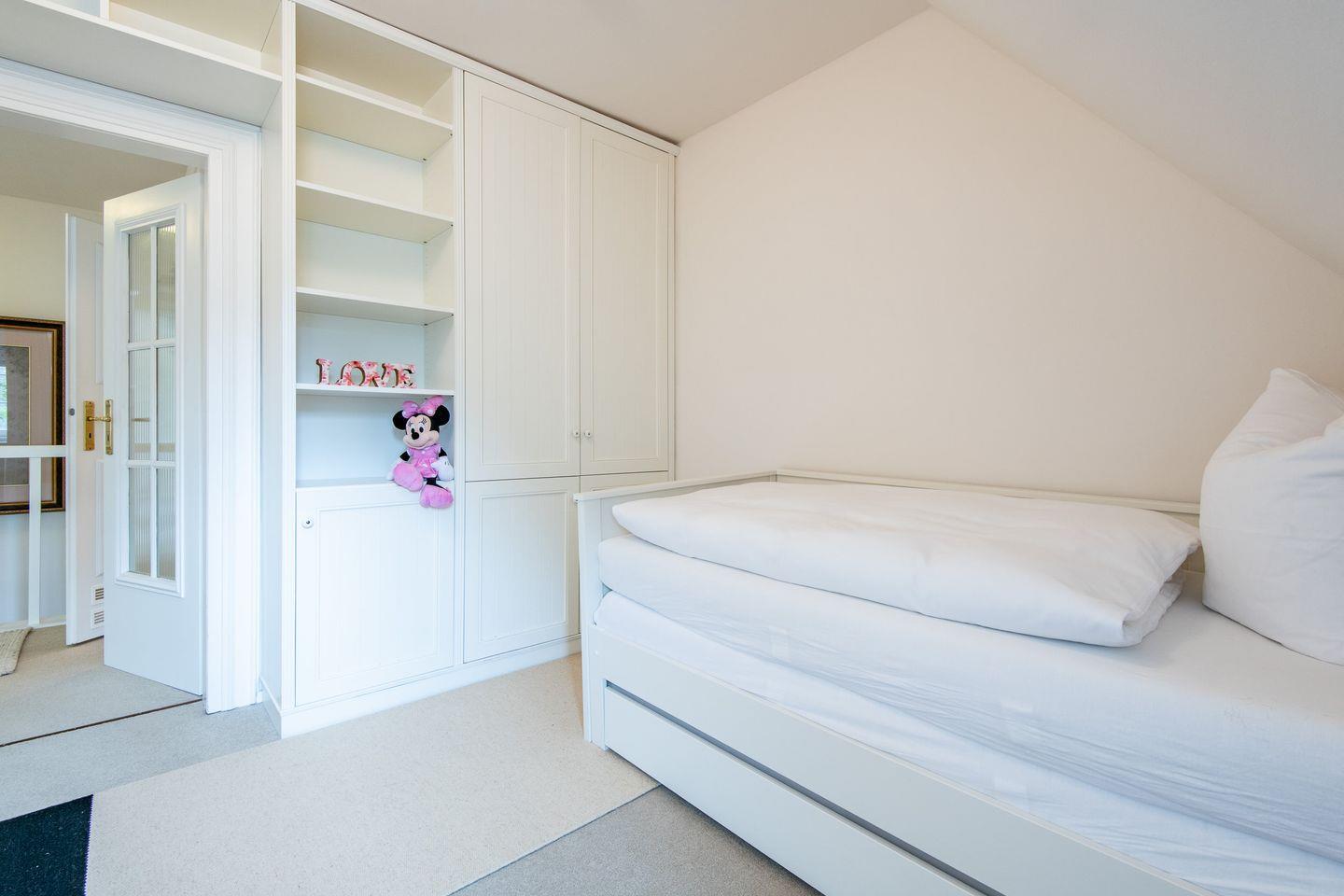 Die drei geschmackvoll eingerichteten Schlafzimmer bieten erholsamen Schlafkomfort. Ein Schlafzimmer ist mit einem großzügigen Doppelbett (200x200 cm) und einem Regal ausgestattet. Die weiteren beiden Schlafzimmer verfügen über Einzelbetten, die jeweils auf eine Doppelbettgröße von 180x200 cm ausgezogen werden können, sowie über Kleiderschränke. Diese Zimmer bieten eine ruhige und behagliche Atmosphäre für entspannte Nächte.