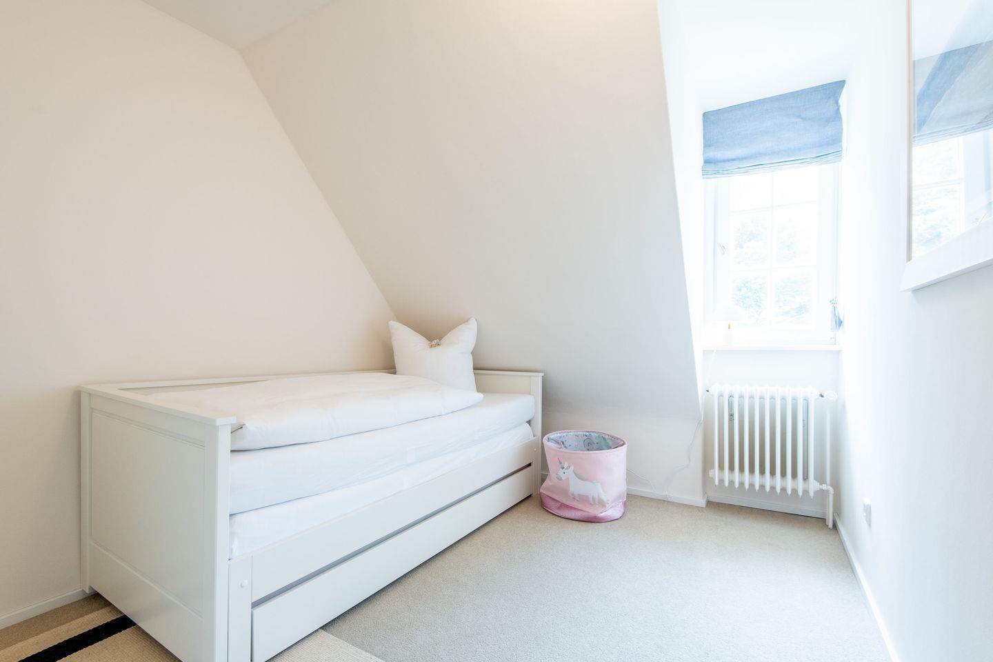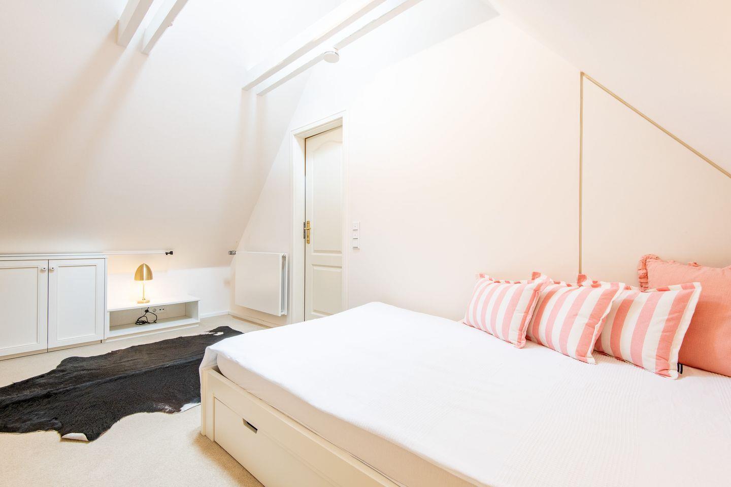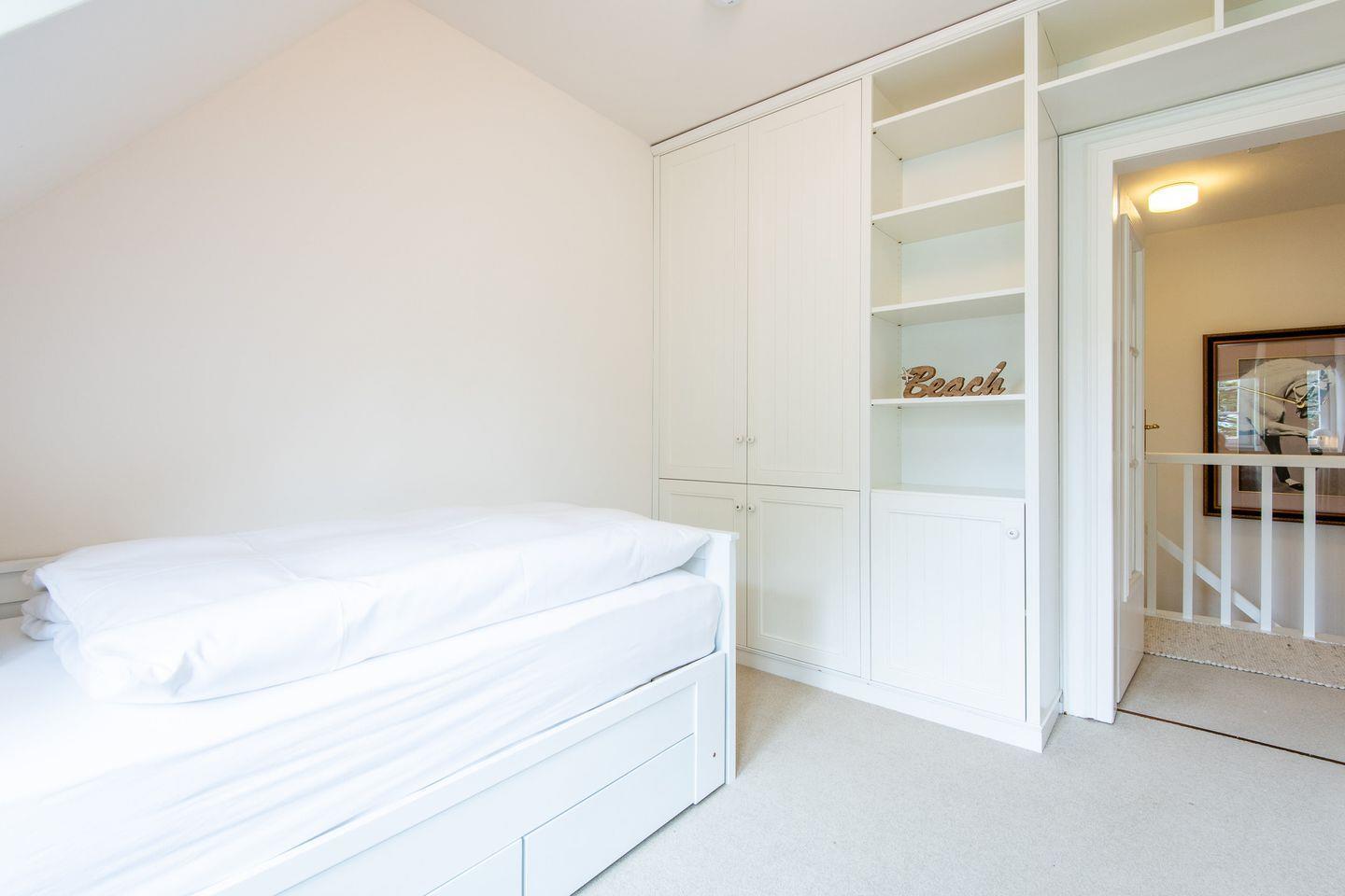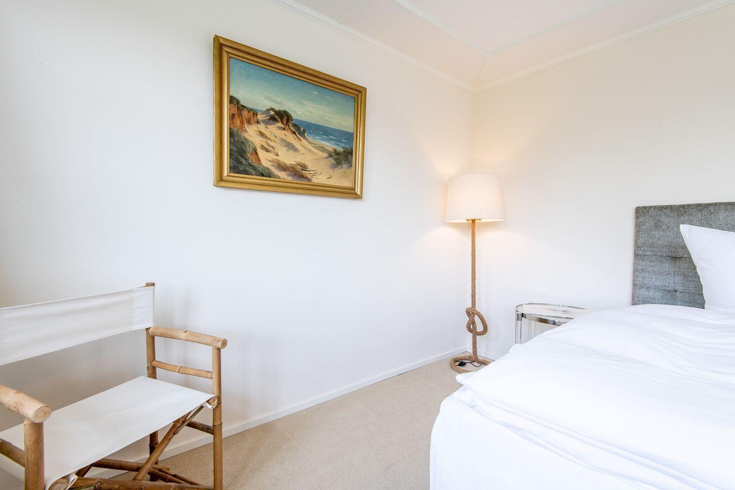 Die drei geschmackvoll eingerichteten Schlafzimmer bieten erholsamen Schlafkomfort. Ein Schlafzimmer ist mit einem großzügigen Doppelbett (200x200 cm) und einem Regal ausgestattet. Die weiteren beiden Schlafzimmer verfügen über Einzelbetten, die jeweils auf eine Doppelbettgröße von 180x200 cm ausgezogen werden können, sowie über Kleiderschränke. Diese Zimmer bieten eine ruhige und behagliche Atmosphäre für entspannte Nächte.