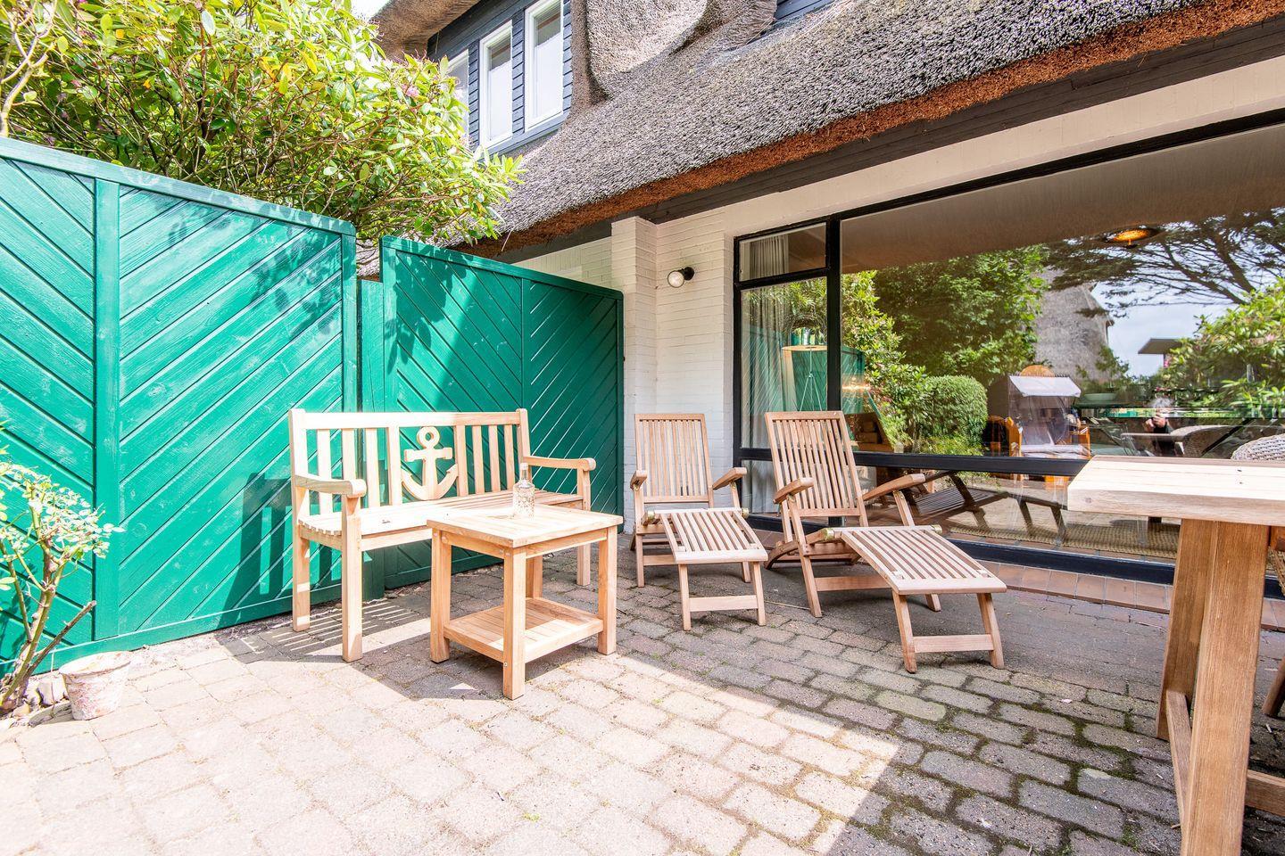 Das großzügige Wohn- und Esszimmer mit bequemer Sitzgarnitur lädt zum Entspannen ein. Hier können Sie nach einem erlebnisreichen Inseltag gemeinsam mit Familie oder Freunden entspannen. Die Südterrasse und der eigene Gartenbereich mit Sitzgelegenheiten bieten den perfekten Rahmen für Frühstück im Freien oder gesellige Abende in der Natur.