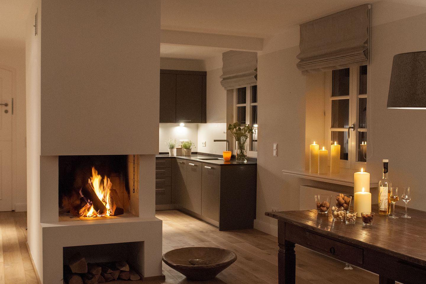 Erdgeschoss: Flur, Gäste-WC mit Dusche, komplett eingerichtete offene Küche Nespresso- und Filterkaffeemaschine, Wohnzimmer mit Essbereich, offenem Kamin und TV, großer, eingewachsener Garten mit Südost-Terrasse Gartenmöbeln und Strandkorb