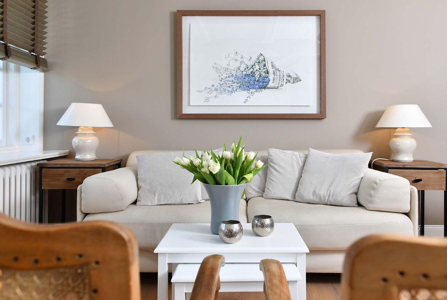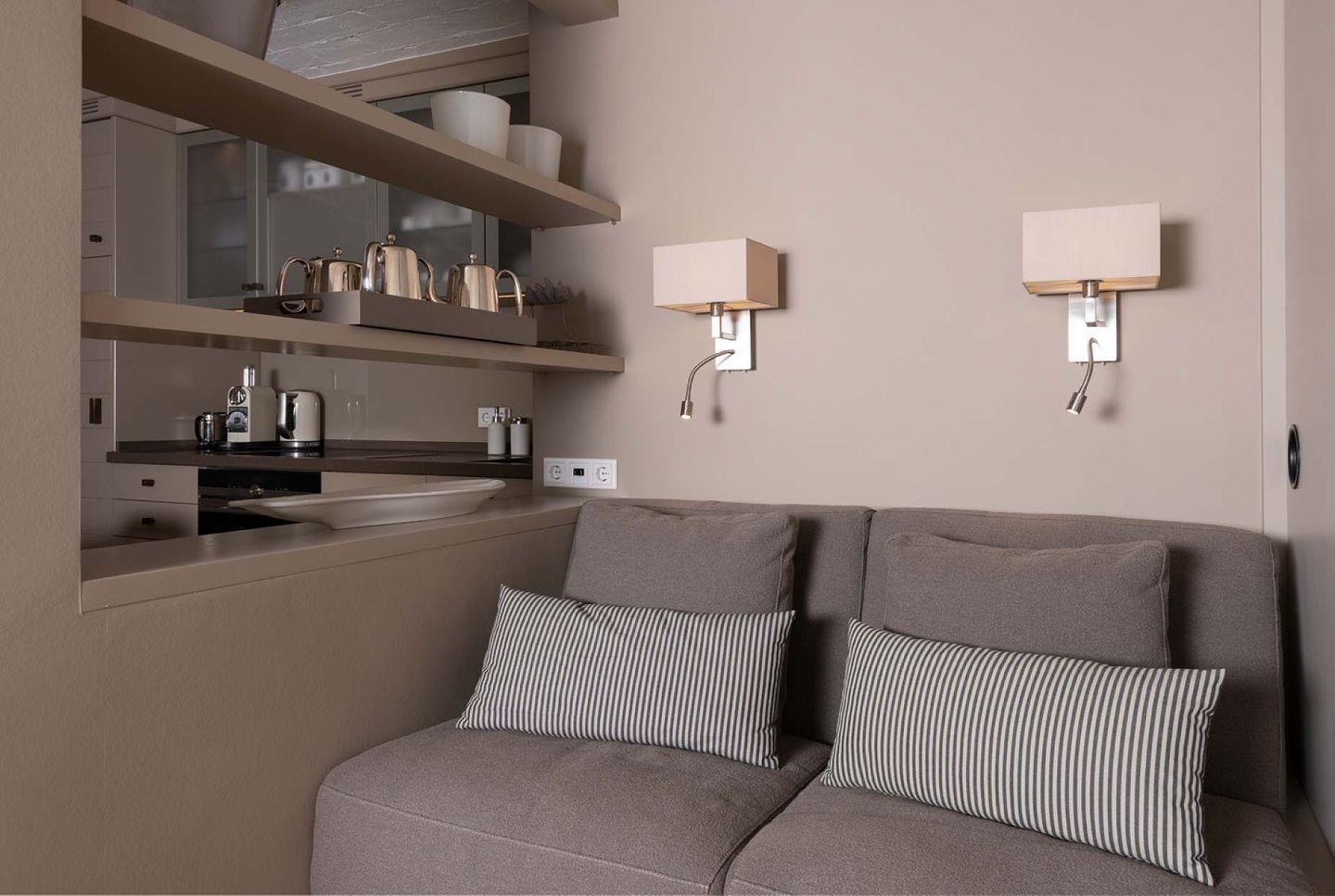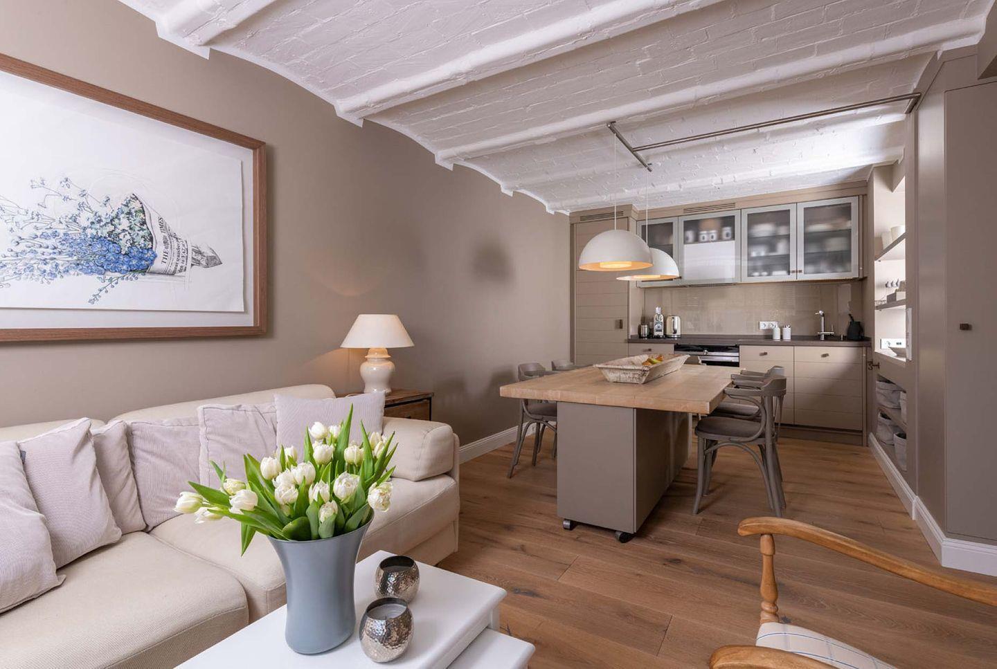 Das exklusive 4-Sterne Ferien Domizil Stutenhof 13 liegt am Gurtstig mitten in Keitum. Im Frühjahr 2019 wurde es umfassend und hochwertig renoviert. Zwei Personen finden hier auf zwei Ebenen und 55 m² ausreichend Platz. Eine nach Südwesten ausgerichtete 25 m² große Terrasse, eingewachsen in eine alte Gartenanlage, bietet wunderschöne, geschützt hinter Rhododendren liegende Sonnenplätze. Der moderne Hausteil unter Reet erwartet seine Gäste in freundlicher Atmosphäre. Holzrollos im Wohnbereich zaubern eine romantische Lichtatmosphäre auf dem gemütlichen Sofa. Der große Esstisch verbindet die offene und umfangreich ausgestattete Küche mit dem Wohnbereich. Alles ist durchdacht, jeder Platz wird genutzt. So befindet sich zwischen Küche und Treppenaufgang ein zweites Sofa, das tagsüber auch als gemütliche Leseecke genutzt werden kann. In der Verwendung von Sand- und Naturtönen im gesamten Ferien Domizil und der mit viel Liebe für Details ausgesuchten und zusammengefügten Möbel und Accessoires wurde sehr viel Wert daraufgelegt, dass seine Bewohner sich wohlfühlen. Ein Ferien Domizil für den besonderen Rückzug mitten in Keitum.