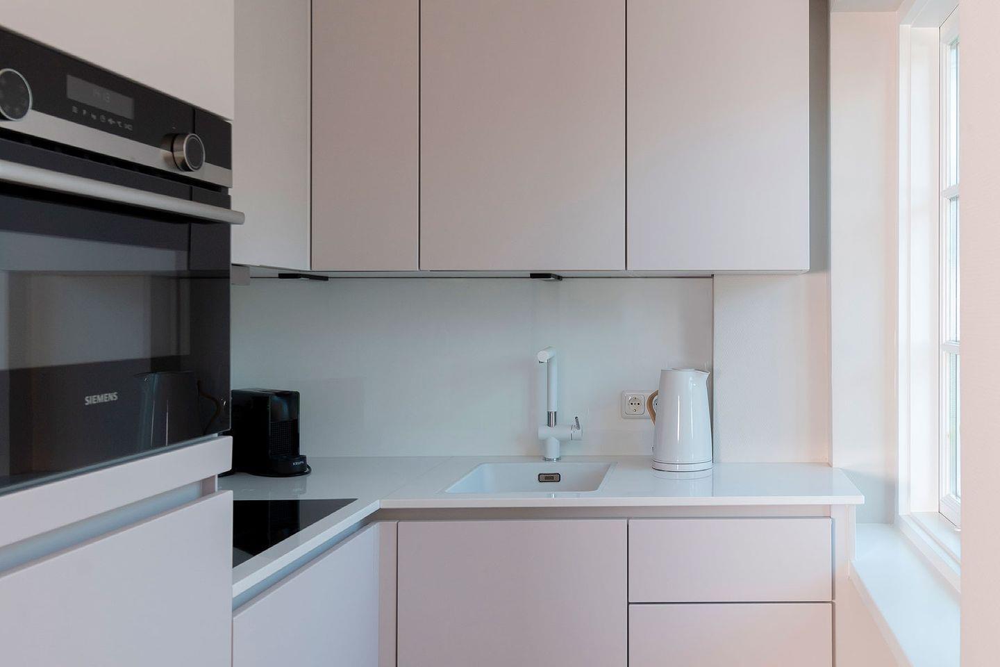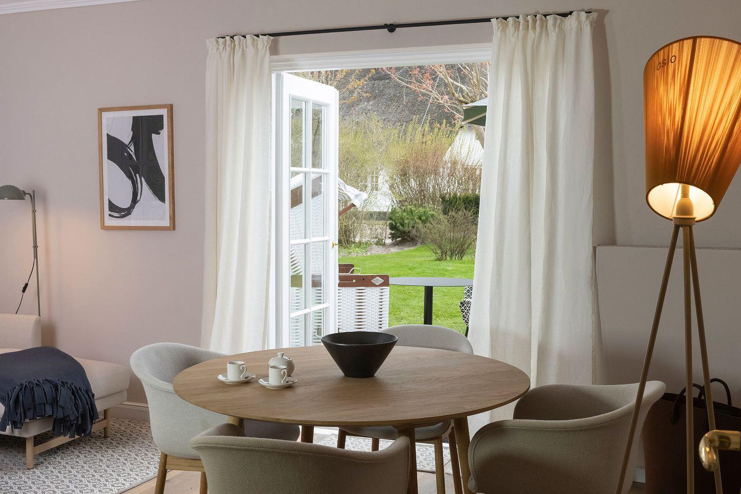 Erdgeschoss: Flur, Ess- und Wohnbereich mit TV im skandinavisch-modernem Stil und offener Küche mit Nespressomaschine, 2 Terrassen davon 1 Richtung Süden und 1 Richtung Osten mit Gartenmöbeln und Strandkorb (April - Oktober),