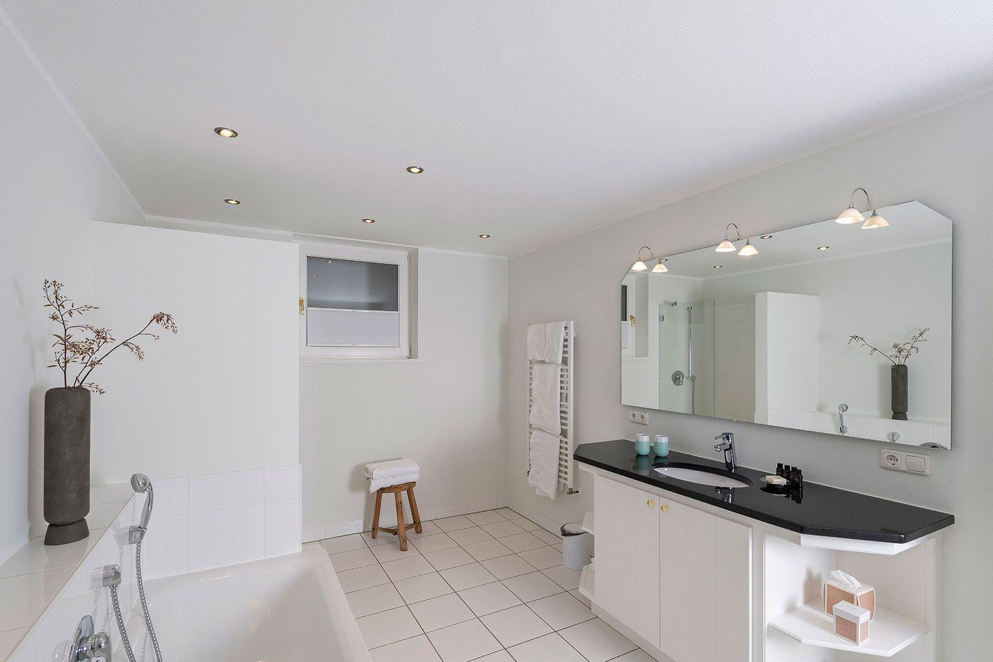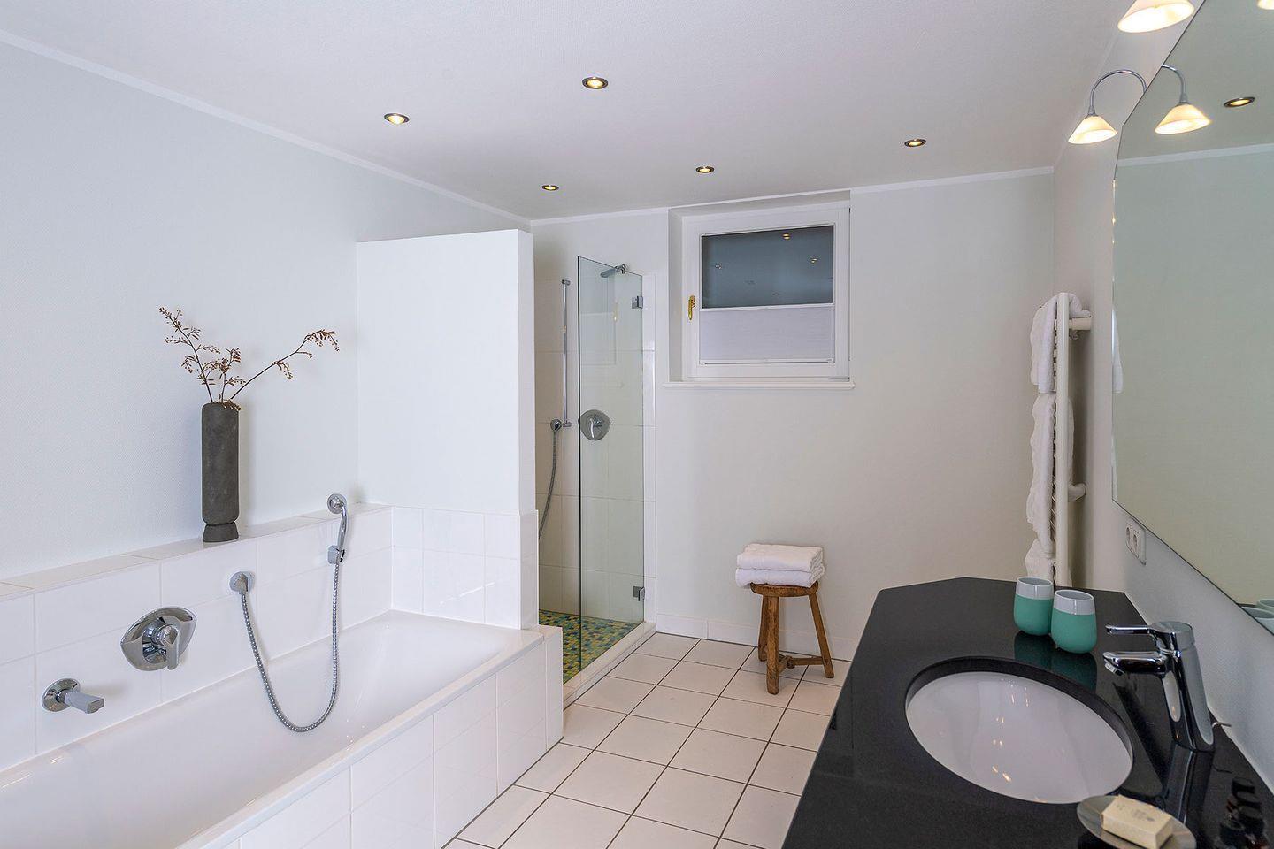 Souterrain: 1 Doppelzimmer mit TV und kleiner Sitzecke, Badezimmer mit Badewanne, Dusche und WC