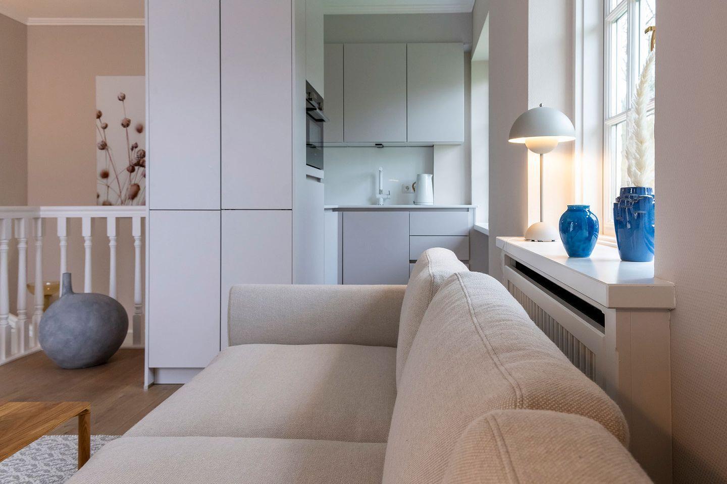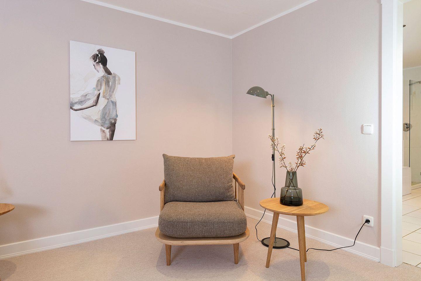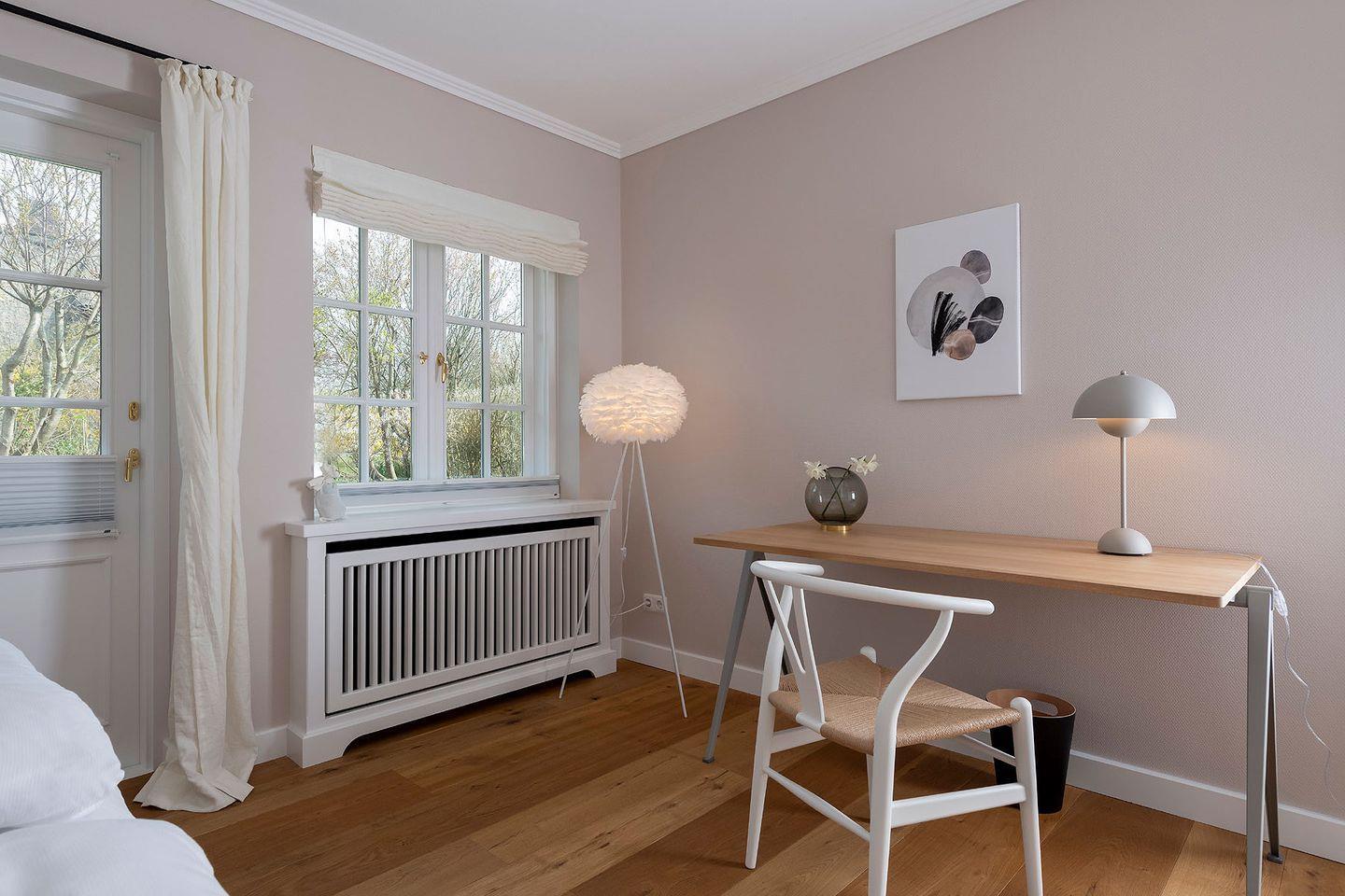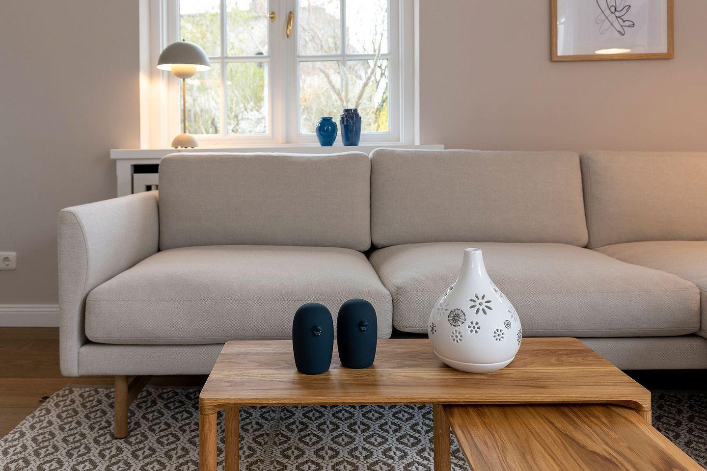 WohnZeit im Ferien Domizil »Leichte Brise« verspricht Leben in luftigen Räumen, eingerichtet mit nordischen Designklassikern wie z.B. dem von Wim Rietveld in den sechziger Jahren entworfenen »Pyramid Schreibtisch« oder dem »Wishbone Chair«. Die Farben der Nordsee – Luft-, Sand-, Seen- und Wälderfarben – sind die Inspirationsquelle fu¨r die neue Farbwelt des Groot's Hu¨s. Sie finden sich in den Wandtönen und tragen so schöne Namen wie »Light Sand«, »Powder Nude« und »Ocean«. Klare Linien und Formen, helles und dunkles Holz, Felle und Naturtextilien erzeugen eine harmonische Atmosphäre. Der Wohn-Essraum ist mit einer modernen, kompakten Ku¨chenzeile ausgestattet.