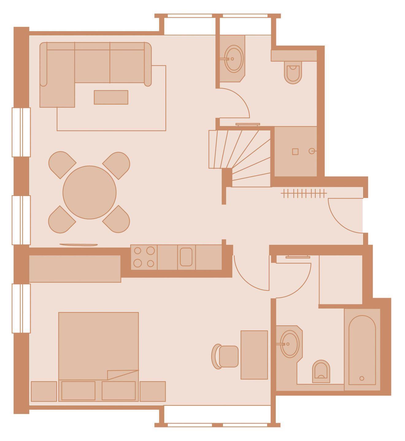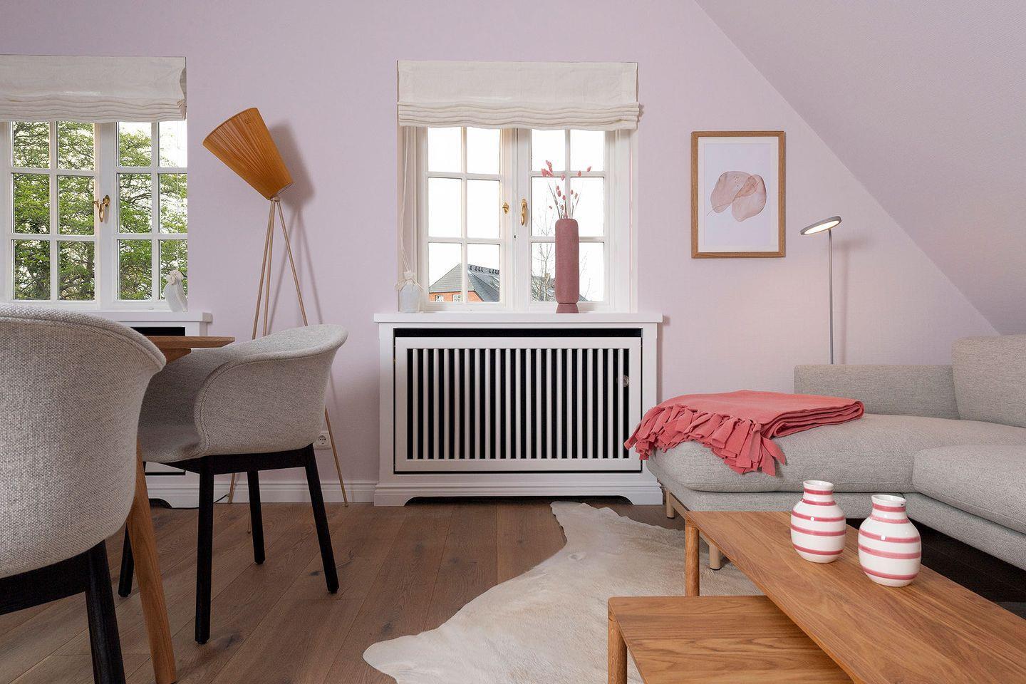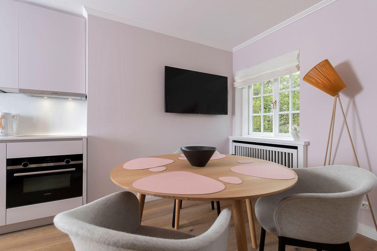 Die Farben der Inneneinrichtung verkörpern Achtsamkeit, Fu¨rsorge und Naturverbundenheit. Die nudefarbenen Wände bieten den perfekten Rahmen fu¨r minimalistisches, zeitloses Design wie z.B. fu¨r die 1968 vom dänischen Designer Verner Panton entworfene Tischleuchte »Flowerpot« und die von Broberg & Ridderståle fu¨r das Interior-Label Muuto designte filigrane »Leaf LED« Tischleuchte. Leben im Ferien Domizil »Du¨nensand« verspricht Wohnen in luftigen Räumen mit zwei Schlafräumen und zwei Bädern. Es bietet den perfekten Rahmen fu¨r ein gemu¨tliches Miteinander von Familie und Freunden. Der Wohn- und Essbereich ist mit einer modernen, kompakten Ku¨chenzeile ausgestattet.