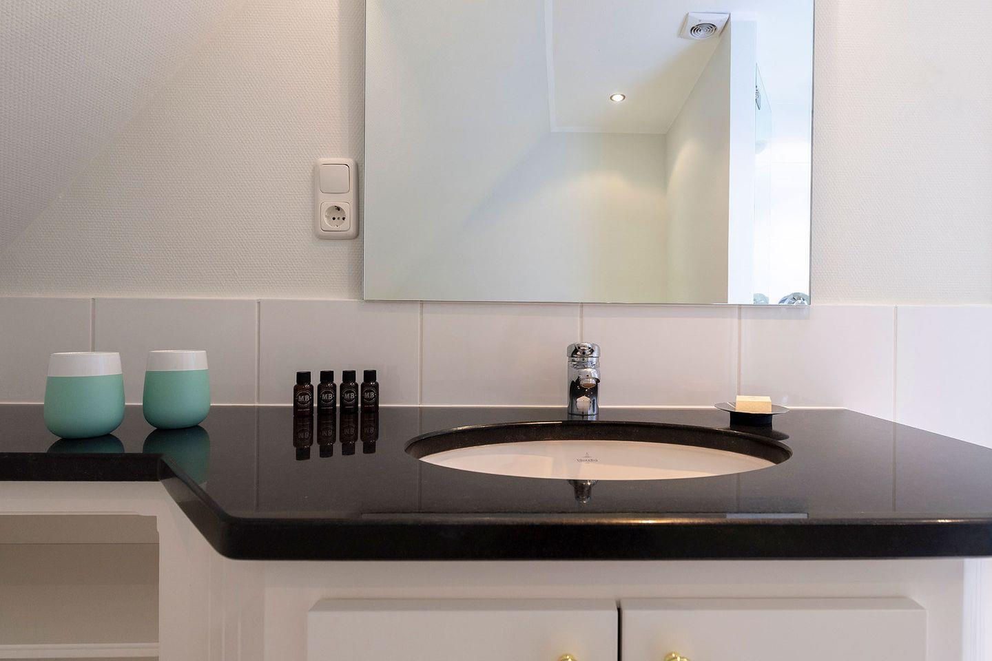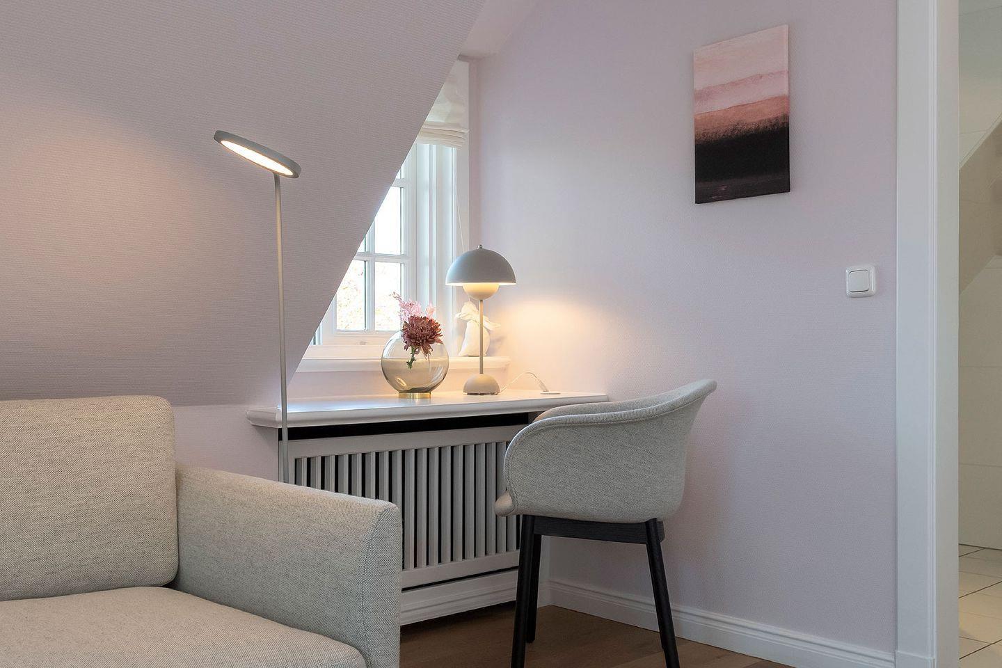 Oberschoss: Flur, 1 Doppelschlafzimmer mit angrenzendem Bad mit Badewanne, Dusche und WC, Ess- und Wohnbereich im skandinavisch-modernem Stil mit TV, offene Küche mit Nespressomaschine, ein weiteres Bad mit Dusche und WC