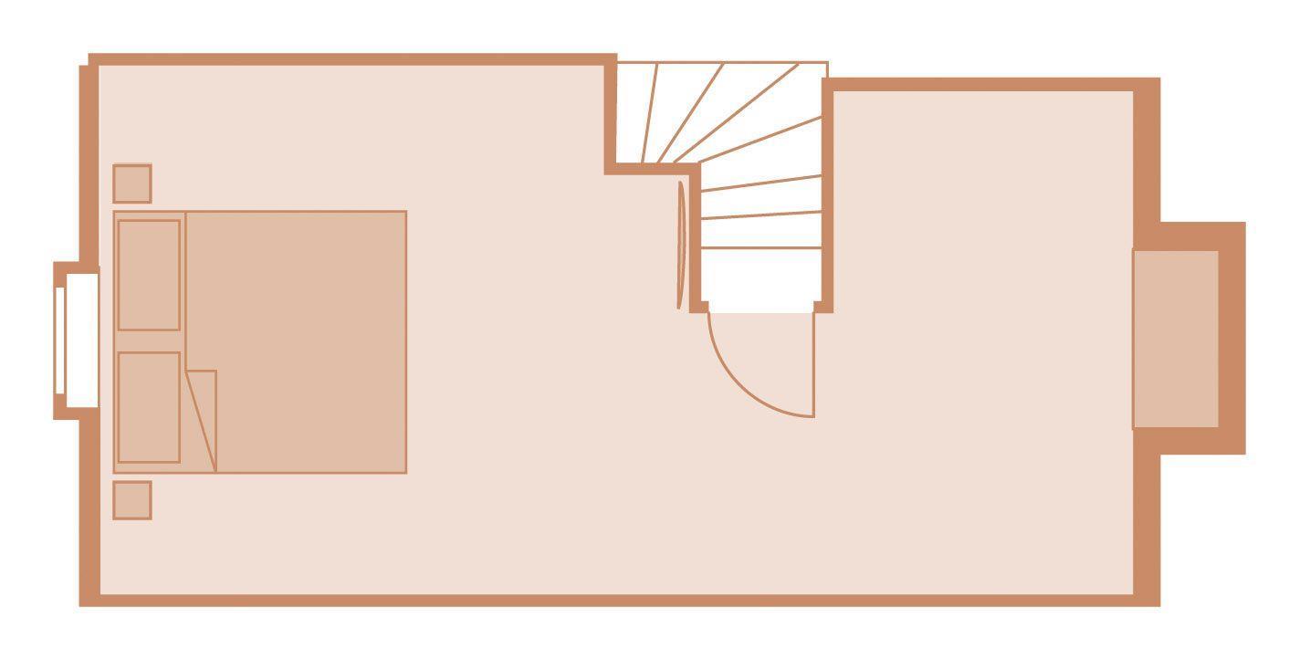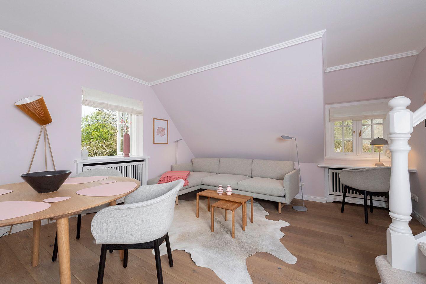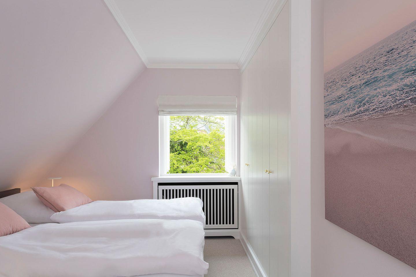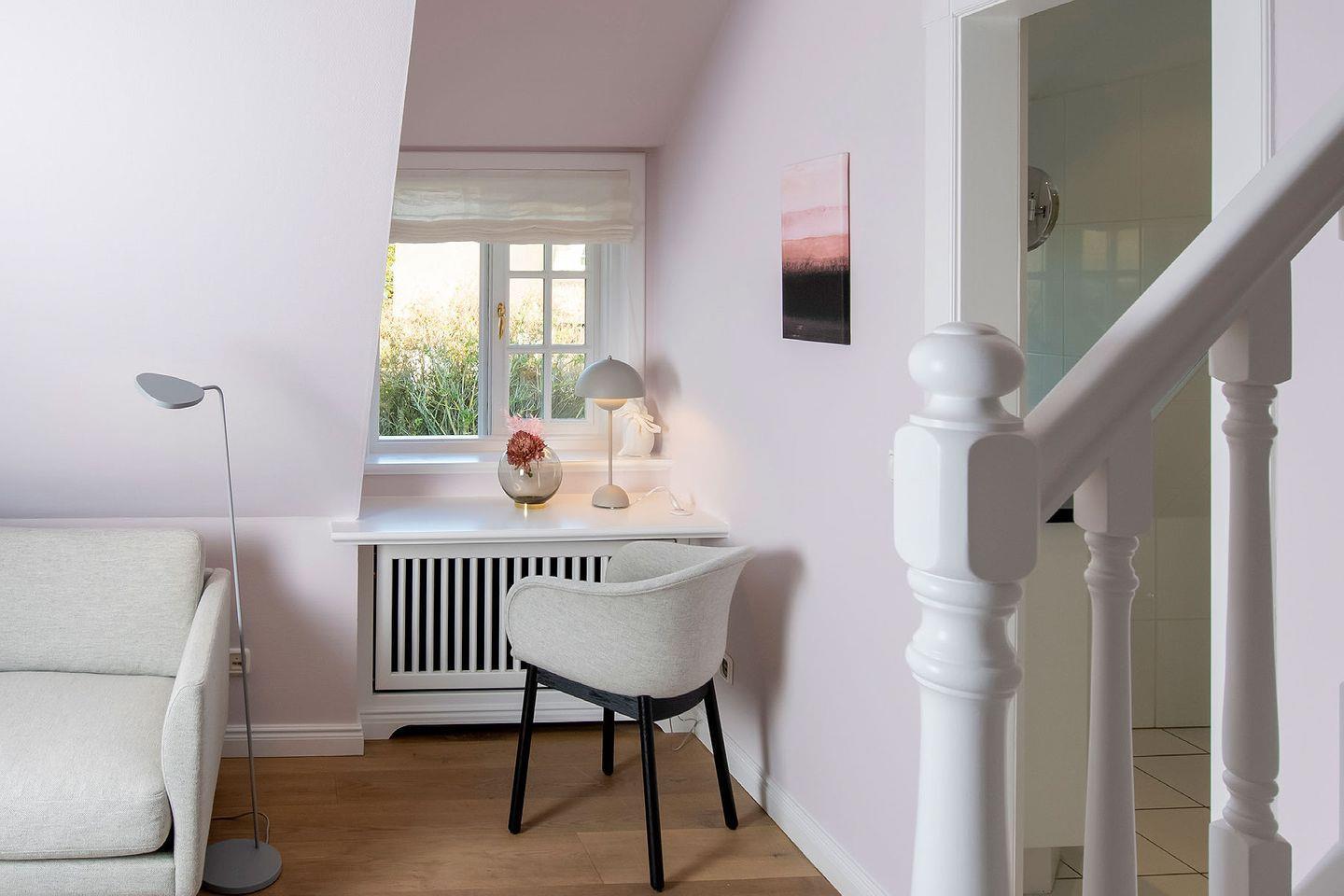 Das Ferien Domizil »Du¨nensand« befindet sich in Obergeschoss und Spitzgiebel des Groot's Hu¨s und bietet fu¨r maximal vier Personen mit 70 m² ausreichend Platz, um gemeinsam auf zwei Ebenen entspannte Urlaubstage zu verbringen. Ein wunderbarer, sonnenbeschienener Terrassenplatz im Gemeinschaftsgarten mit Strandkorb und Gartenmöbeln erweitert den Wohnbereich im Gru¨nen.