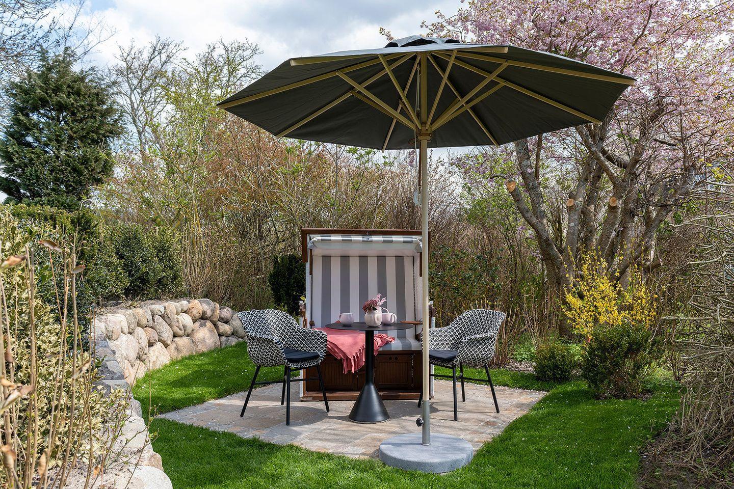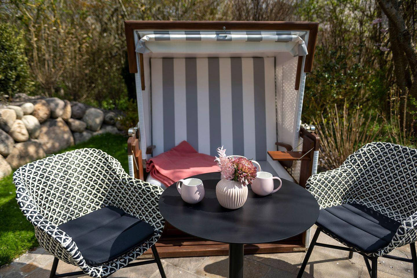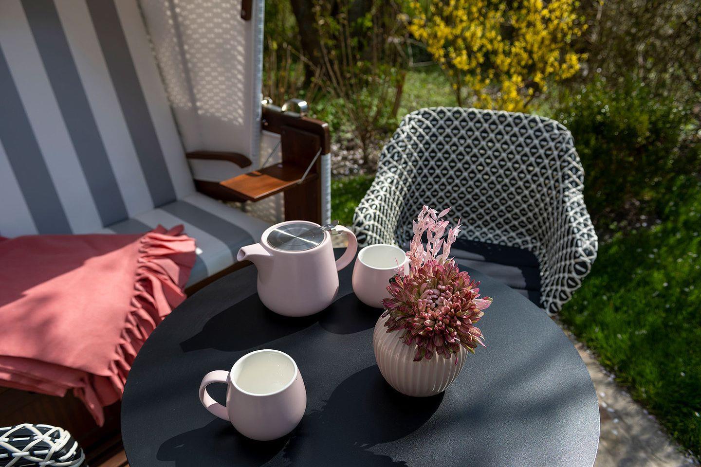 Im Garten steht ein Strandkorb sowie Gartenmöbel zur Verfügung (Ostausrichtung; April - Oktober).