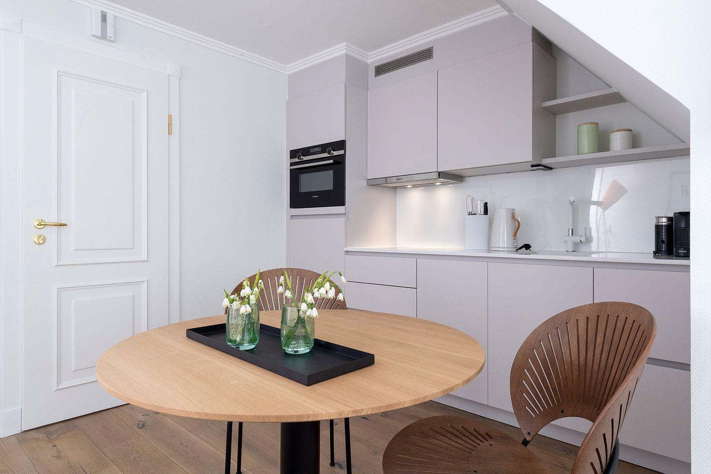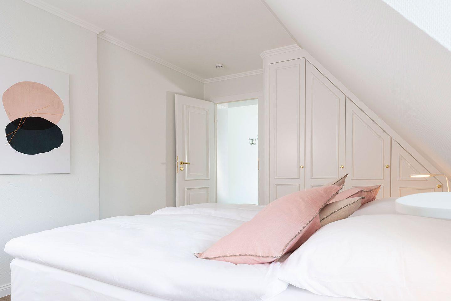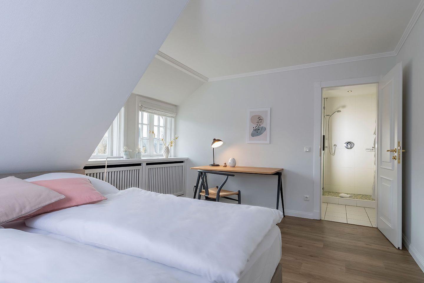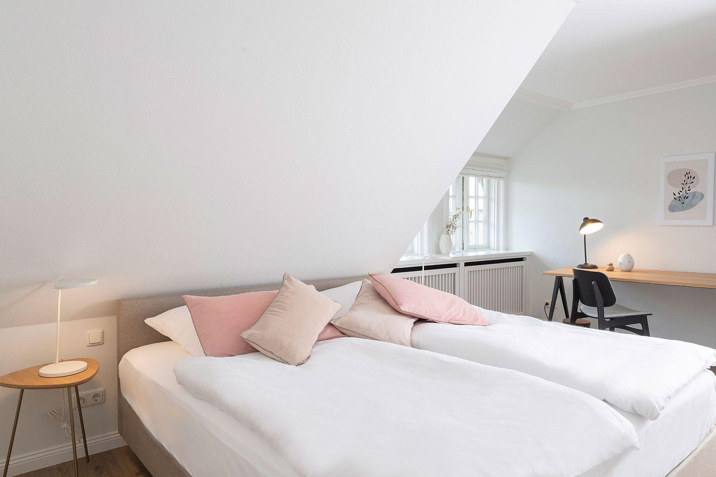 Das Ferien Domizil »Meeresstrand« befindet sich im Obergeschoss des Groot‘s Hu¨s und bietet fu¨r zwei Personen auf 41 m² ausreichend Platz, um entspannte Urlaubstage zu verbringen. Ein wunderbarer, sonnenbeschienener Terrassenplatz im Gemeinschaftsgarten mit Gartenmöbeln und Strandkorb erweitert den Wohnbereich im Gru¨nen. Klare Linien und Formen, helles und dunkles Holz, Felle und Naturtextilien erzeugen eine harmonische Atmosphäre. Die Farben der Nordsee – Luft-, Sand-, Seen- und Wälderfarben – sind die Inspirationsquelle fu¨r die neue Farbwelt des Groot‘s Hu¨s. Sie finden sich in den Wandtönen und tragen so schöne Namen wie »Light Sand«, »Powder Nude« und »Ocean«. WohnZeit im Ferien Domizil »Meeresstrand« verspricht Leben in luftigen Räumen, eingerichtet mit nordischen Designklassikern wie z.B. dem von Wim Rietveld in den sechziger Jahren entworfenen »Pyramid Schreibtisch« oder dem »Wishbone Chair«. Der Wohn-Essraum ist mit einer modernen, kompakten Ku¨chenzeile ausgestattet.