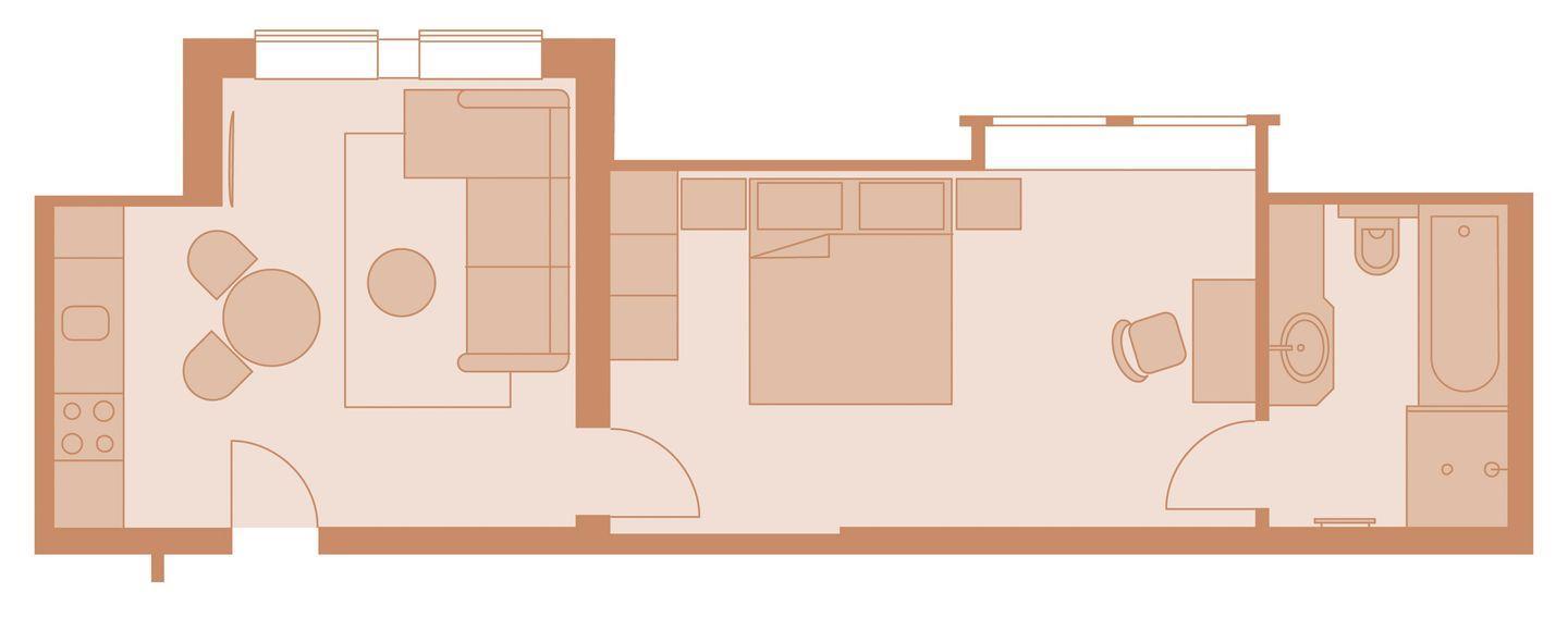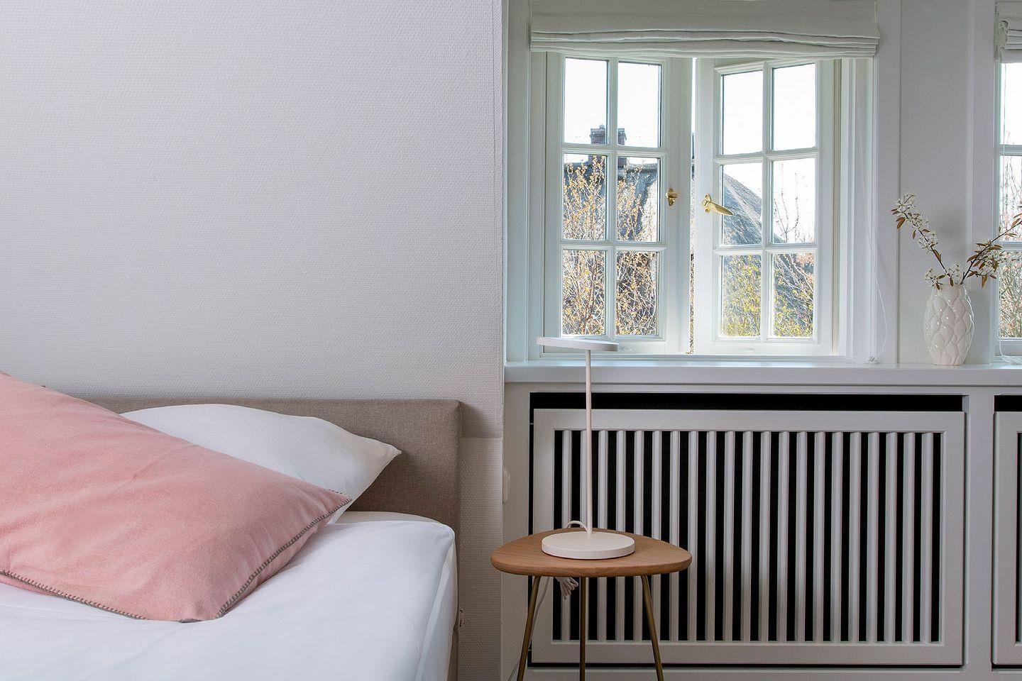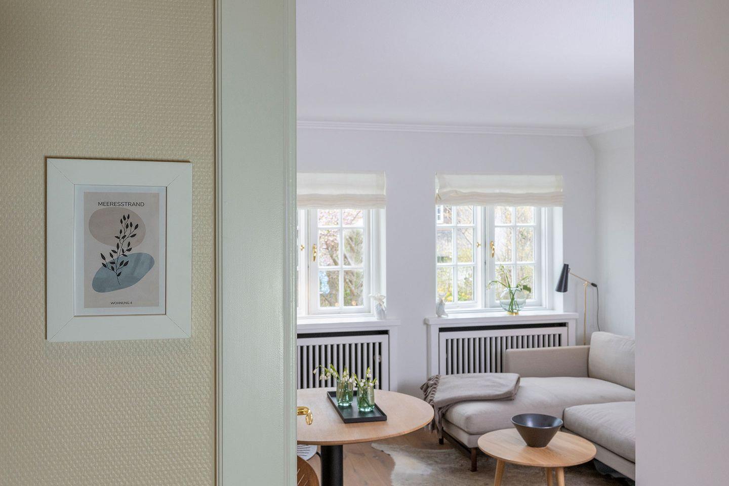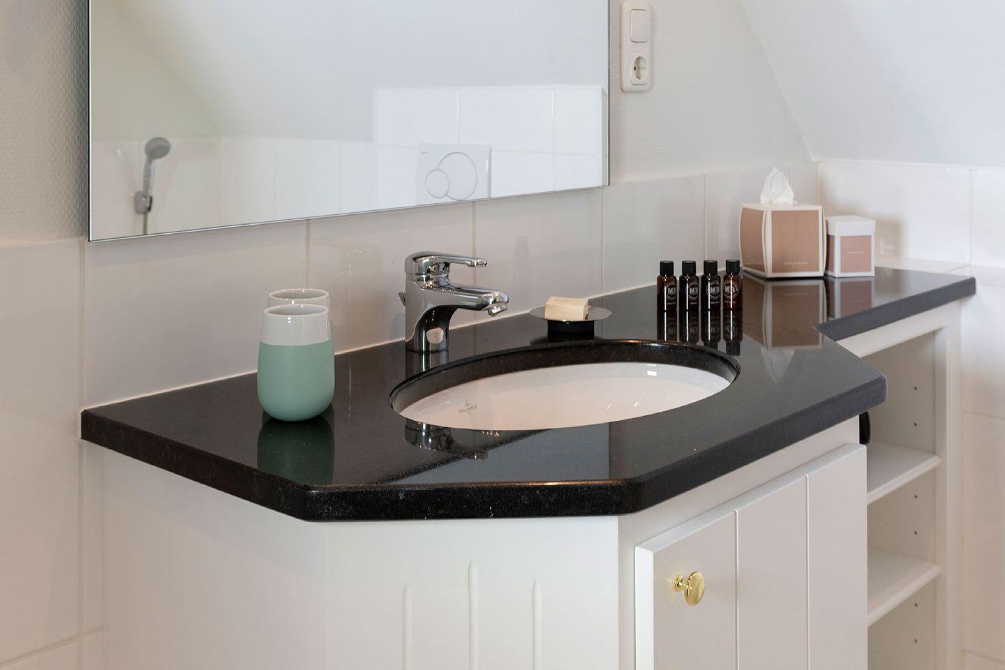 Das Ferien Domizil »Meeresstrand« befindet sich im Obergeschoss des Groot‘s Hu¨s und bietet fu¨r zwei Personen auf 41 m² ausreichend Platz, um entspannte Urlaubstage zu verbringen. Ein wunderbarer, sonnenbeschienener Terrassenplatz im Gemeinschaftsgarten mit Gartenmöbeln und Strandkorb erweitert den Wohnbereich im Gru¨nen. Klare Linien und Formen, helles und dunkles Holz, Felle und Naturtextilien erzeugen eine harmonische Atmosphäre. Die Farben der Nordsee – Luft-, Sand-, Seen- und Wälderfarben – sind die Inspirationsquelle fu¨r die neue Farbwelt des Groot‘s Hu¨s. Sie finden sich in den Wandtönen und tragen so schöne Namen wie »Light Sand«, »Powder Nude« und »Ocean«. WohnZeit im Ferien Domizil »Meeresstrand« verspricht Leben in luftigen Räumen, eingerichtet mit nordischen Designklassikern wie z.B. dem von Wim Rietveld in den sechziger Jahren entworfenen »Pyramid Schreibtisch« oder dem »Wishbone Chair«. Der Wohn-Essraum ist mit einer modernen, kompakten Ku¨chenzeile ausgestattet.