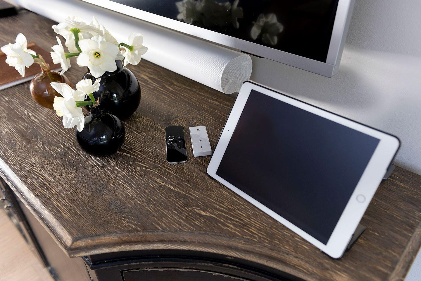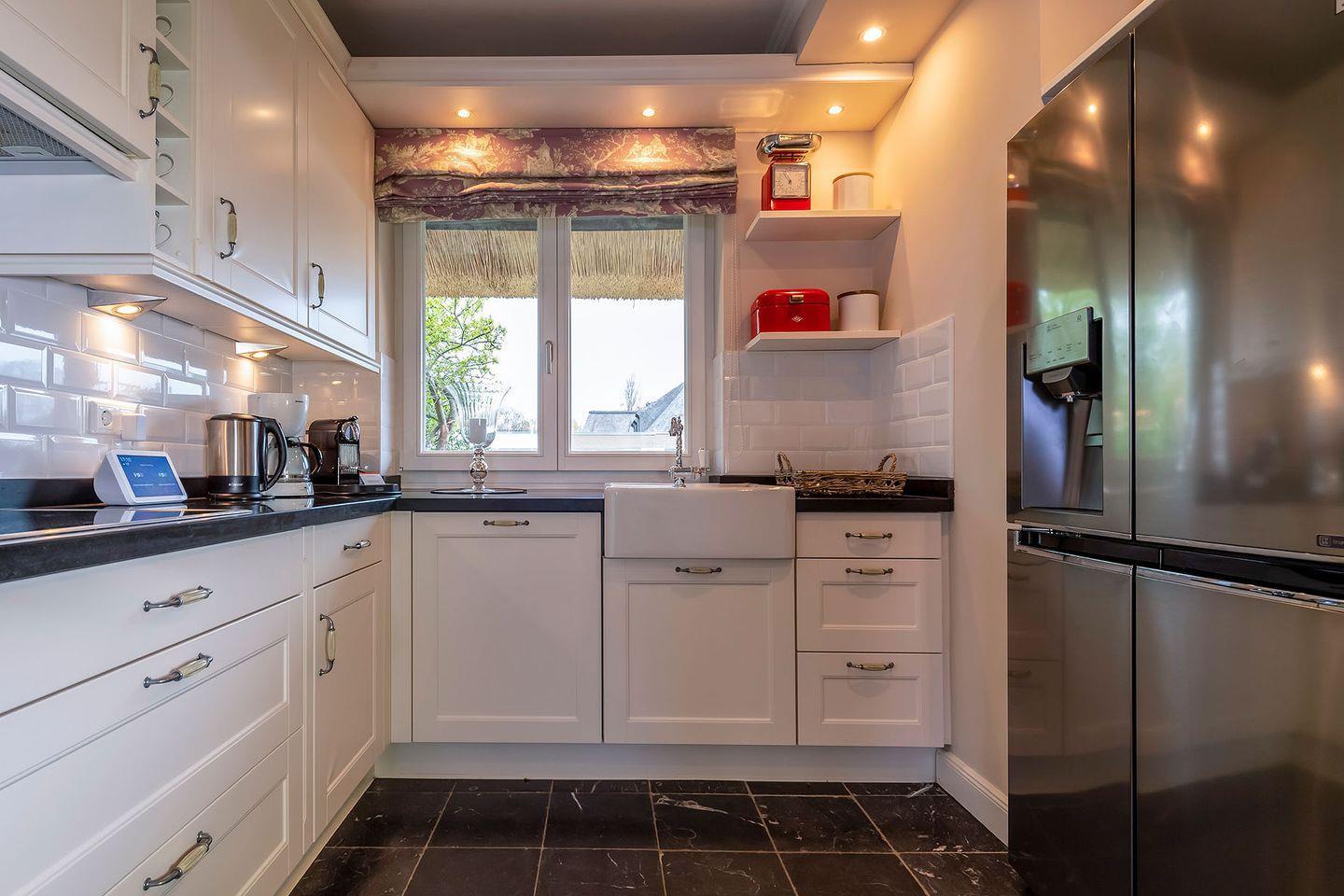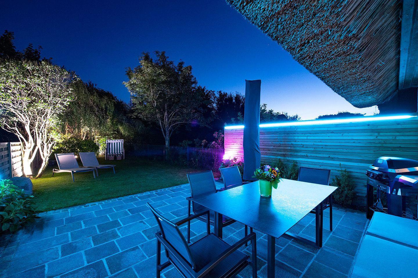 Die sehr umfangreich ausgestattete Ku¨che lässt keine Wu¨nsche offen, sodass gerne aufwendig gekocht und gegrillt werden kann. Der Frenchdoor-Ku¨hlschrank mit Eiswu¨rfel- und Frischwasser-Funktion sorgt dafu¨r, dass auch die Getränke die perfekte Temperatur haben. Ein großer massiver Holzesstisch lädt im maritim anmutenden Ambiente des Wohn- und Esszimmers zu geselliger Tafelrunde ein. Das Ferien Haus wartet mit allerlei technischen Besonderheiten auf. Das Philips Hue Lichtsystem, das u¨ber das hauseigene iPad steuerbar ist, beleuchtet in frei wählbaren Lichtfarben die Terrasse und Bäume im Garten und zaubert eine angenehme Atmosphäre. Fu¨r gute mediale Unterhaltung sorgt das Apple TV mit Sky und Bundesliga, Amazon-Prime und Netflix. Sonos Boxen im Wohn-Essbereich und auf der Terrasse bieten eine hohe Klangqualität und nahezu alle verfu¨gbaren Songs per Streaming fu¨r Musikliebhaber. Das ideale Domizil fu¨r alle Technikfans.