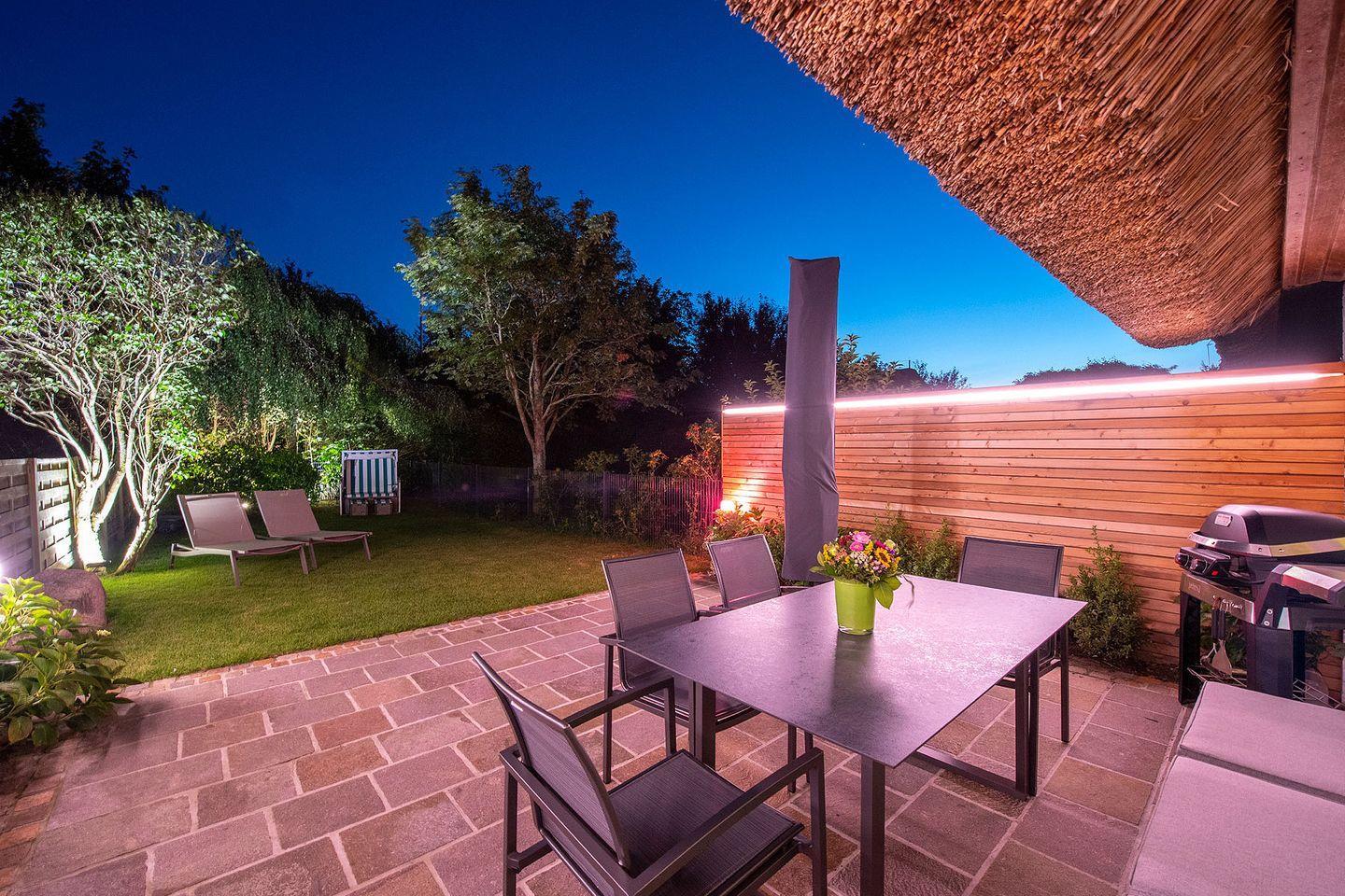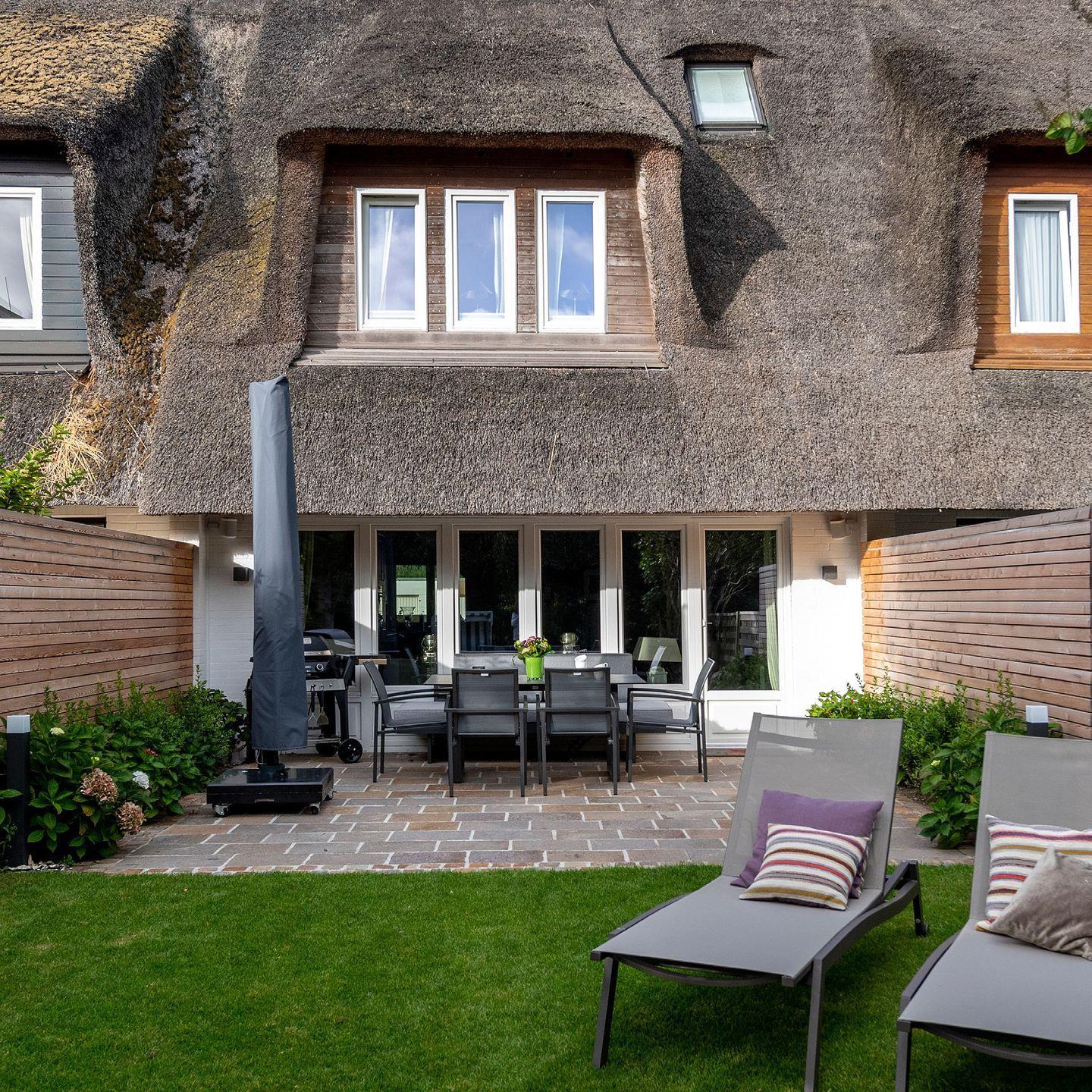Das exklusive 5-Sterne Ferien Domizil im Hingstwai 8 in Keitum bietet fu¨r maximal sechs Personen auf zwei Ebenen und 110 m2 Raum, um genussvolle Urlaubstage zu verbringen. Die nach Westen ausgerichtete Naturstein-Terrasse erweitert den Wohnbereich zu den Sonnenplätzen im Garten. Hochwertige Gartenmöbel und ein Weber Elektrogrill laden zum Entspannen und Wohlfu¨hlen im komplett neu angelegten Garten ein – ein idealer Ru¨ckzugsort fu¨r Familie und Freunde in der Mitte von Keitum.