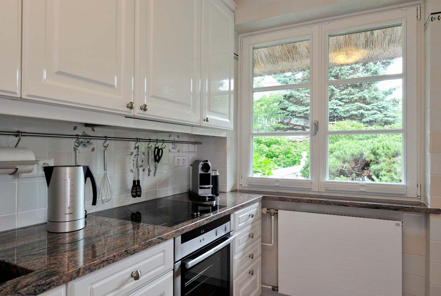 Erdgeschoss: Flur, komplett eingerichtete, separate Küche, Badezimmer mit Dusche und WC, Wohnzimmer mit Esstisch, Kachelofen und TV, großzügiger, eingezäunter Garten, 2 Terrassen (Süden und Osten) mit Gartenmöbeln und Strandkorb