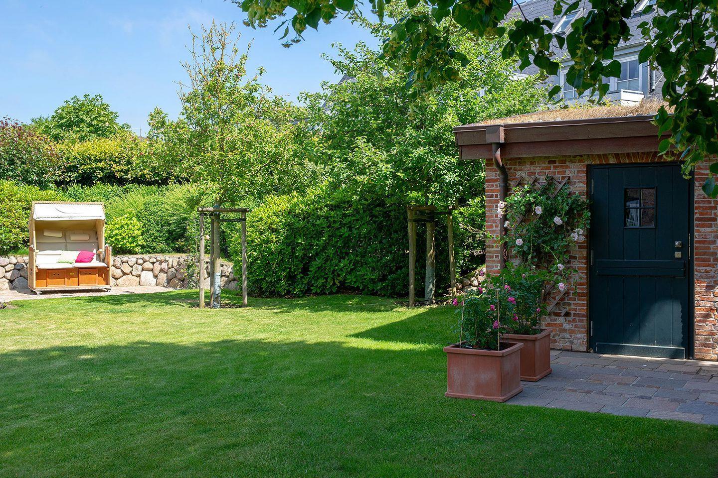 Erdgeschoss: Flur mit Garderobe, Gäste-WC, komplett eingerichtete, offene Küche mit Nespresso-Maschine und Küchentresen, Essbereich, Wohnzimmer mit Kamin und TV, Bibliothek/Arbeitszimmer mit Sitzecke, großzügiger, eingewachsener Garten, 2 Terrassen (Südwesten und Südosten) mit Gartenmöbeln und Strandkorb