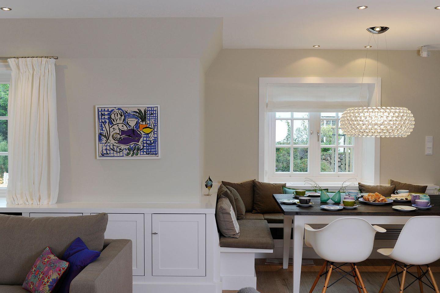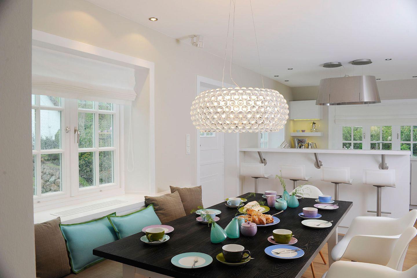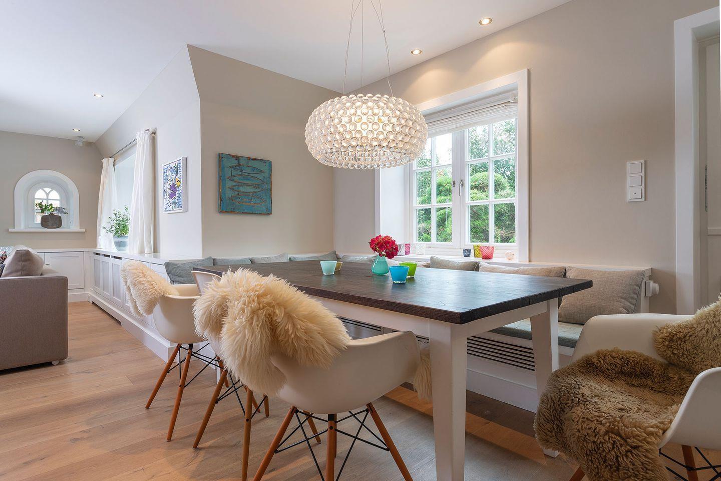 Eine Mischung aus Luxus, Lässigkeit und Modernität prägt das stylische Ambiente des Hauses. So finden sich mutige Farben wie Grasgrün, Pink, Lila und Türkis in Designer-Kissen, Wandfarbe, dem Geschirr von Dibbern und ausgesuchten, liebevollen Dekorationen wieder. Für die Inneneinrichtung wurden nur hochwertige Materialien verwendet und besondere Designdetails wie moderne Foscarini Lampen oder Side Chairs von Charles Eames ausgewählt.