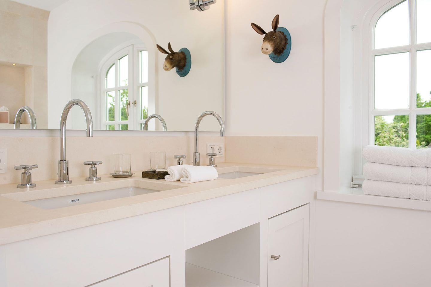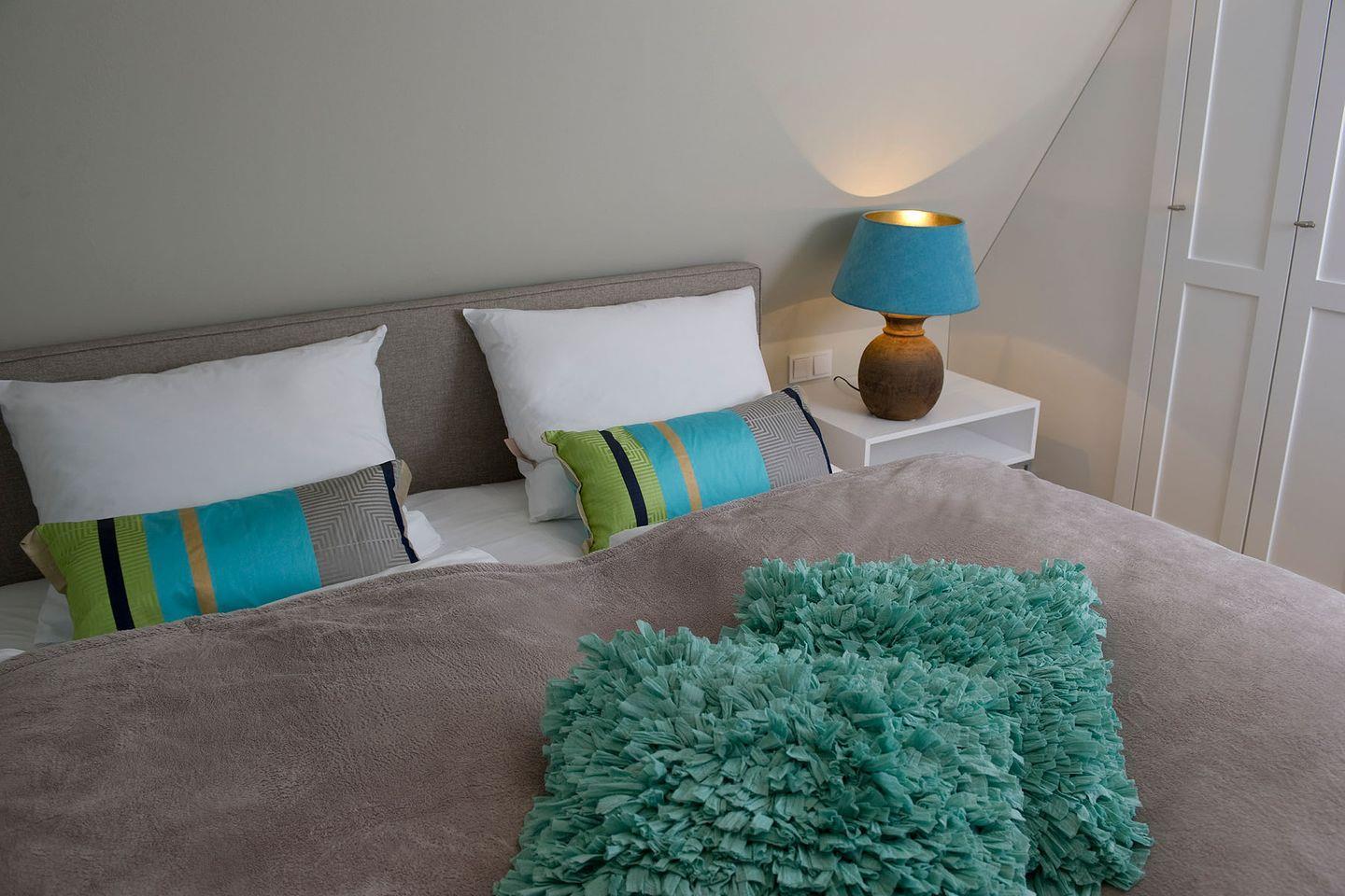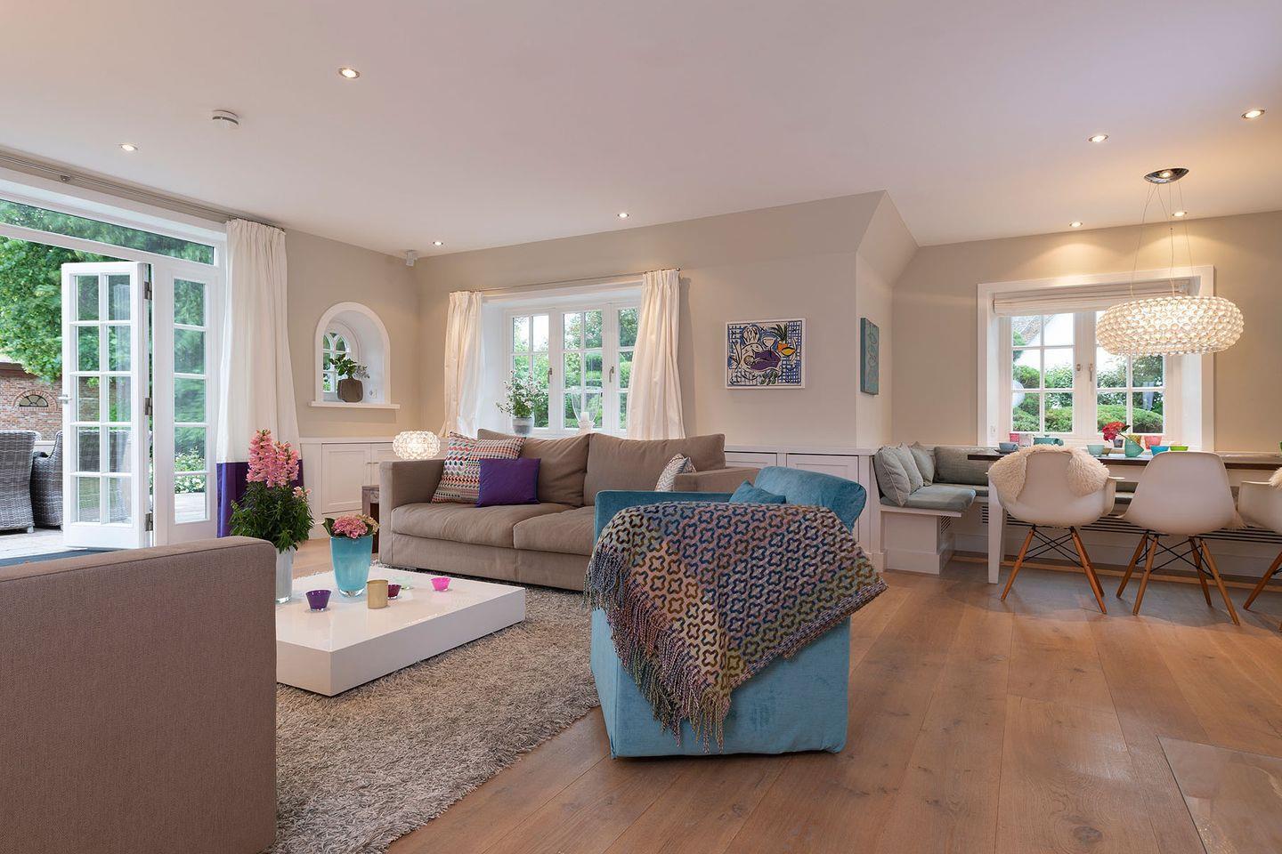 Eine Mischung aus Luxus, Lässigkeit und Modernität prägt das stylische Ambiente des Hauses. So finden sich mutige Farben wie Grasgrün, Pink, Lila und Türkis in Designer-Kissen, Wandfarbe, dem Geschirr von Dibbern und ausgesuchten, liebevollen Dekorationen wieder. Für die Inneneinrichtung wurden nur hochwertige Materialien verwendet und besondere Designdetails wie moderne Foscarini Lampen oder Side Chairs von Charles Eames ausgewählt.