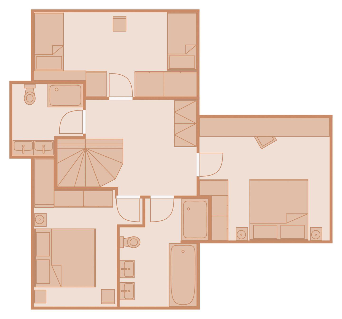 Obergeschoss: 2 Doppelzimmer mit TV, 1 Schlafzimmer mit 2 getrennt stehenden Einzelbetten; 1 Badezimmer mit Badewanne, Dusche und WC, 1 Badezimmer mit Dusche und WC