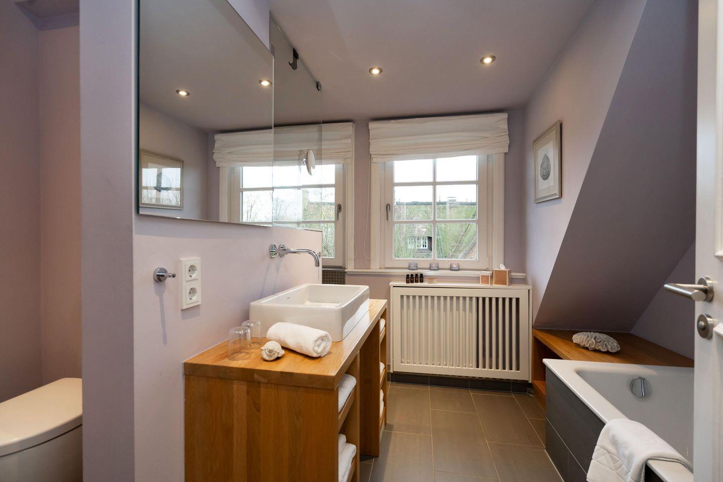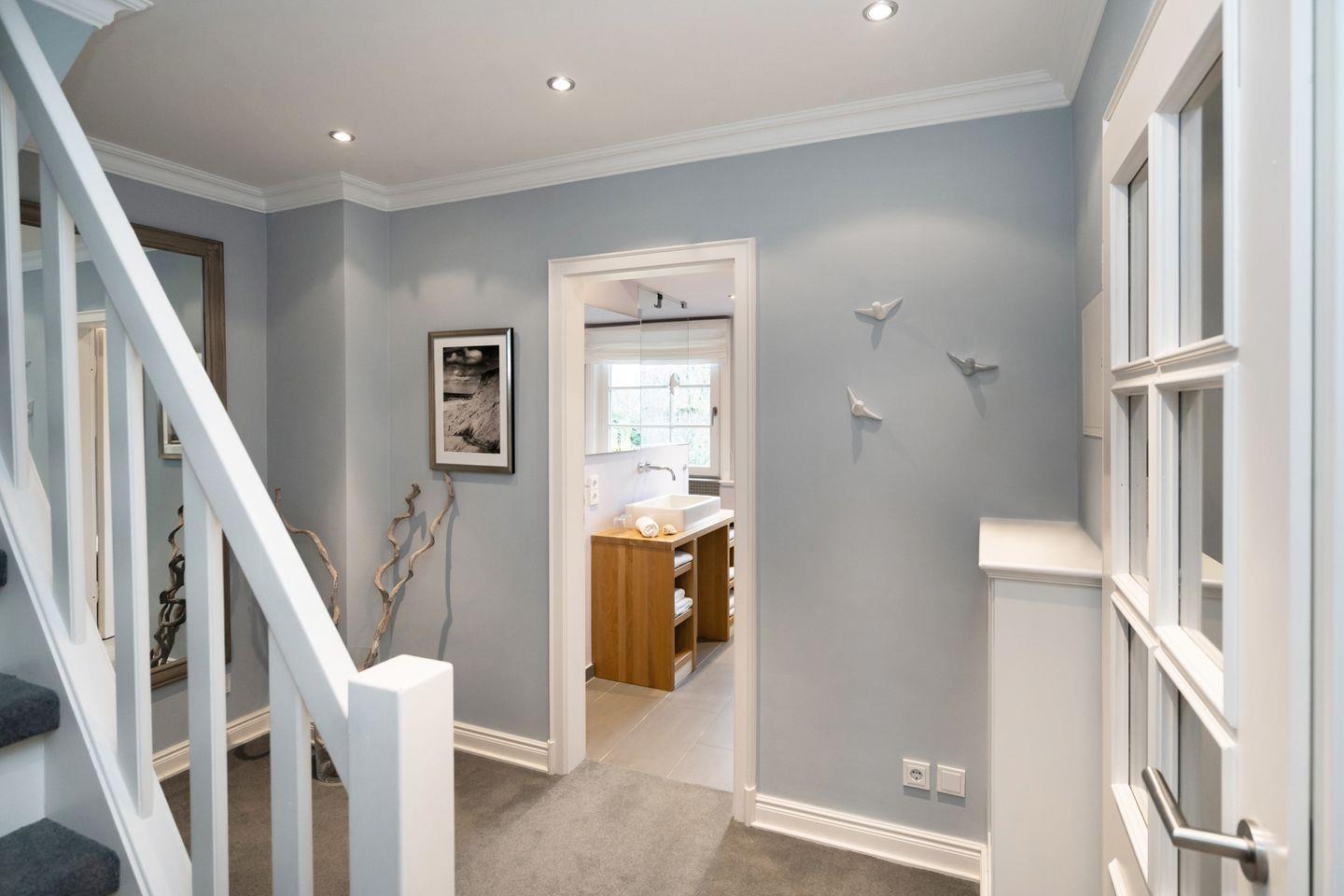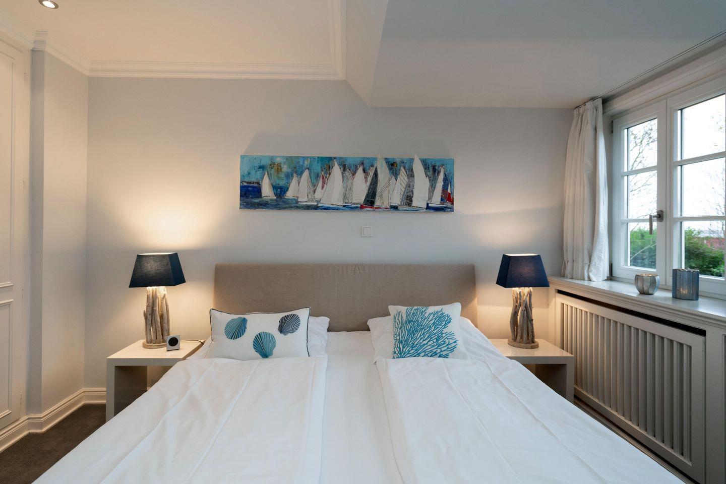 Das exklusive 5-Sterne Ferien Domizil an der Süderstraße 46 II erstreckt sich über vier Ebenen und bietet auf 120 m² in zeitlos moderner Ausstattung viel Platz für maximal sechs Personen. Das helle und offene Wohnzimmer mit Essplatz und angrenzender Küche vermitteln ein Gefühl anspruchsvollen und zeitgemäßen Wohnens. Ein Lieblingsplatz ist der offene Kamin, welcher friesische Gemütlichkeit ins Wohnzimmer zaubert. Helle Pastelltöne in Türkis, Lila und Blau überwiegen in der Farbgebung der Inneneinrichtung und lassen ein außergewöhnliches Wohnambiente entstehen. Stilvoll und mit viel Liebe zum Detail wurde dieser Hausteil unter Reet konzipiert und ausgestattet. Jeder Raum gleicht einer Entdeckungsreise schöner und ausgesuchter Accessoires, die der Lebensraum charmant und liebenswert erscheinen lässt. Ein zauberhafter Ort, um sich zurück zu ziehen. Im Frühjahr 2017 hat das Domizil mit einer neuen Sauna im Souterrain ein weiteres Highlight erhalten. Es lässt sich an kalten Tagen entspannen und die Ruhe Keitums genießen.