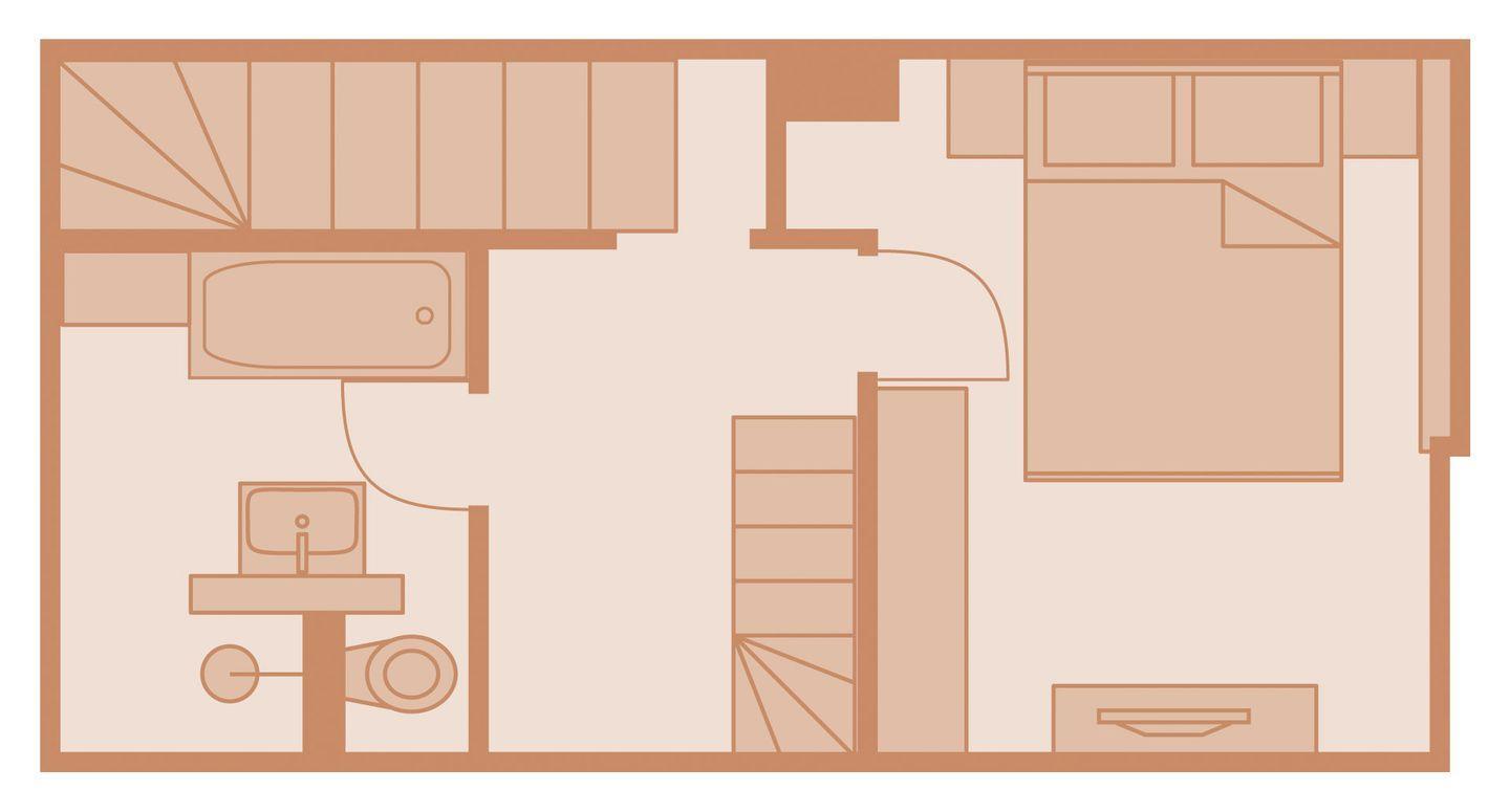 Obergeschoss: 1 Doppelzimmer mit TV, Badezimmer mit Badewanne, Dusche und WC