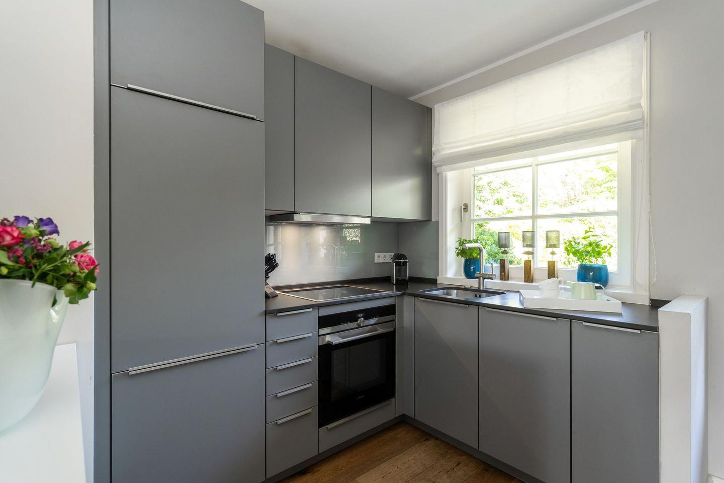Erdgeschoss: Komplett eingerichtete offene Küche mit Nespresso-Maschine, Wohnzimmer mit Essbereich, offenem Kamin, und TV, ruhige Gartenterrasse zum Westen mit Gartenmöbeln