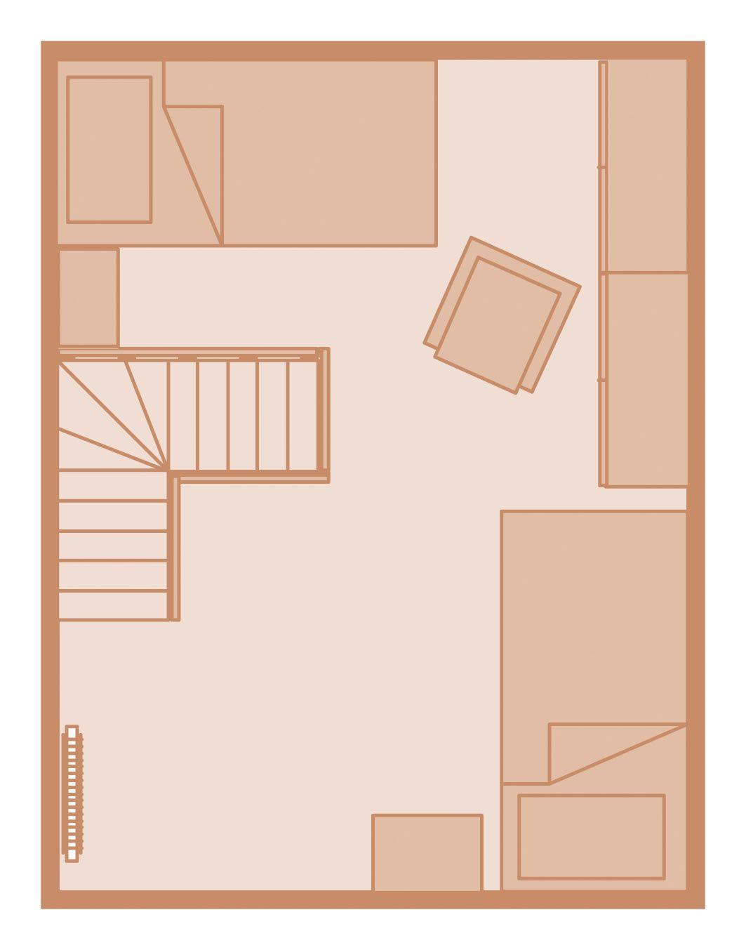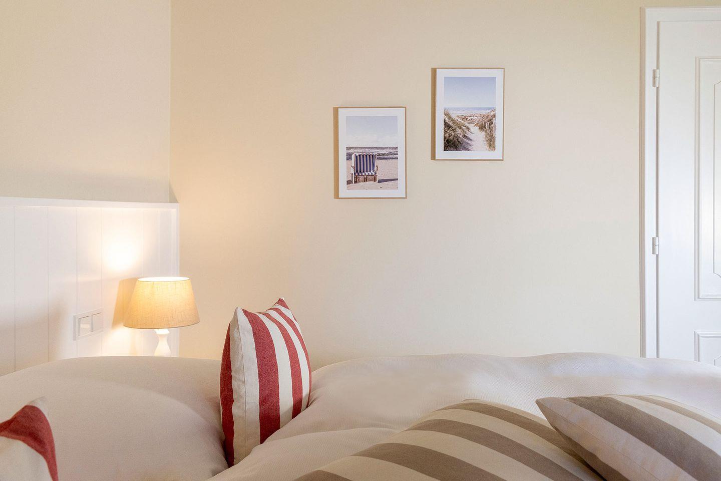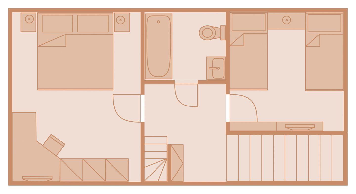 Obergeschoss: 1 Doppelzimmer mit TV; 1 Schlafzimmer mit getrennt stehenden Einzelbetten; 1 Badezimmer mit Duschbadewanne und WC.