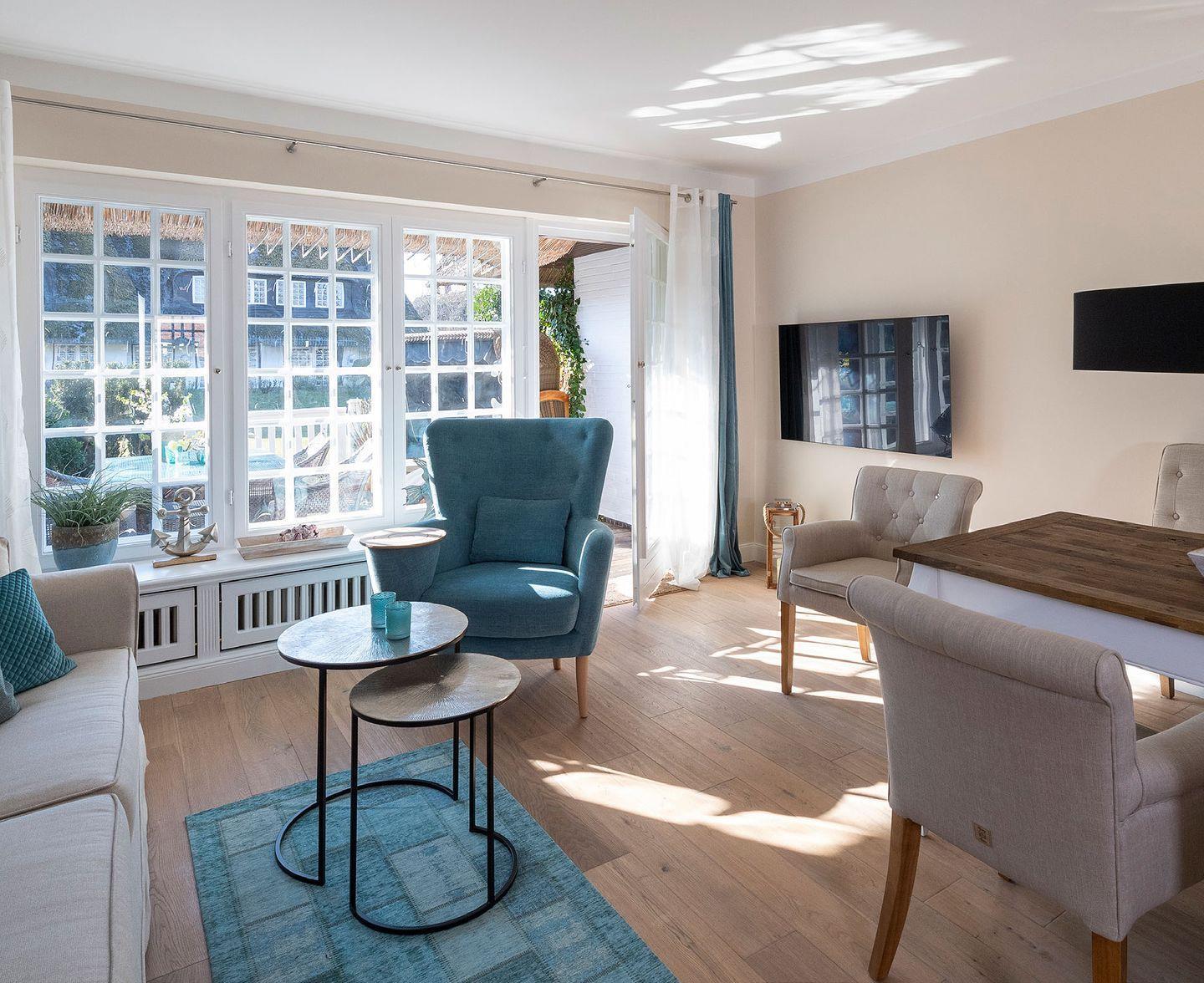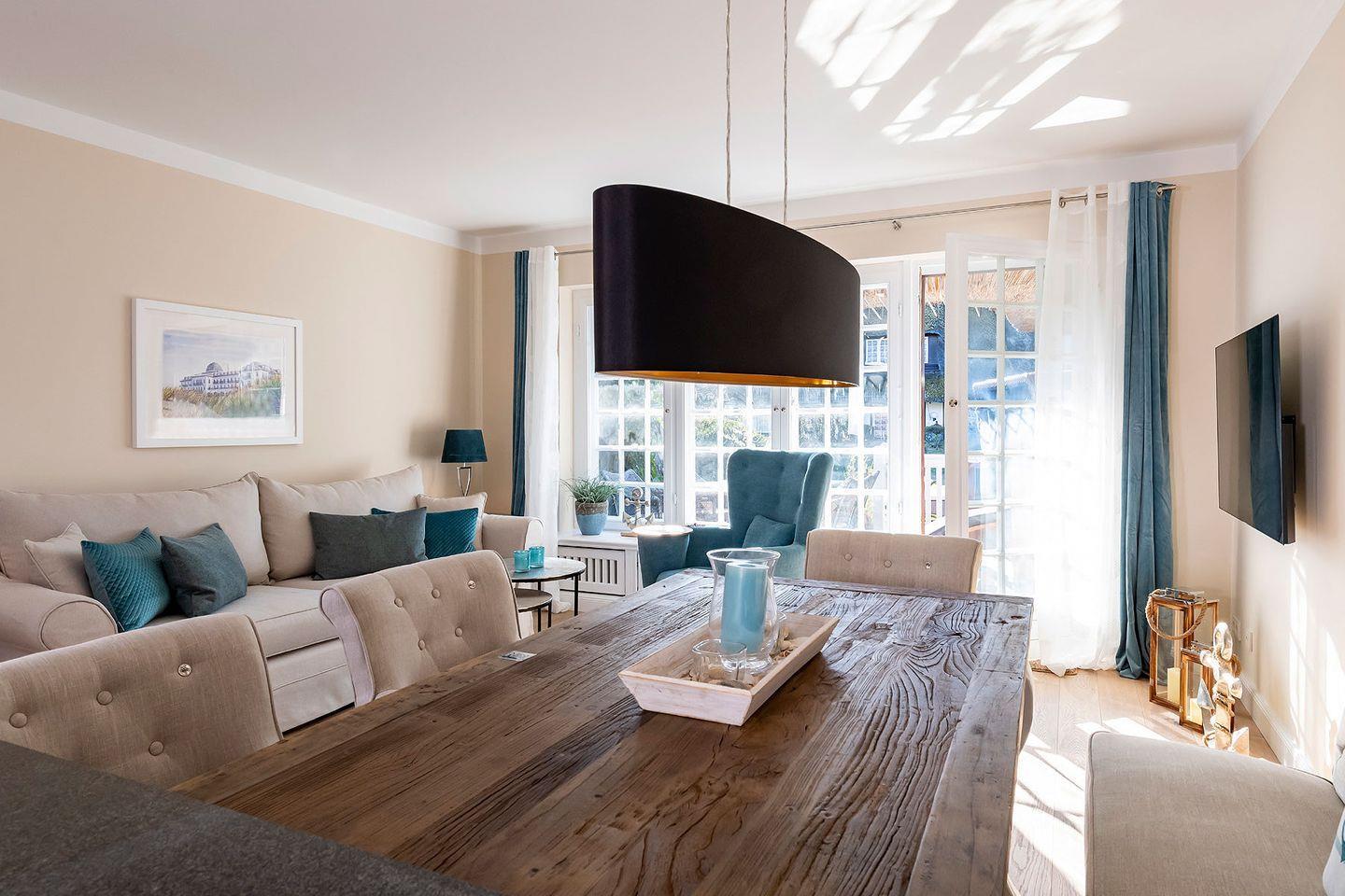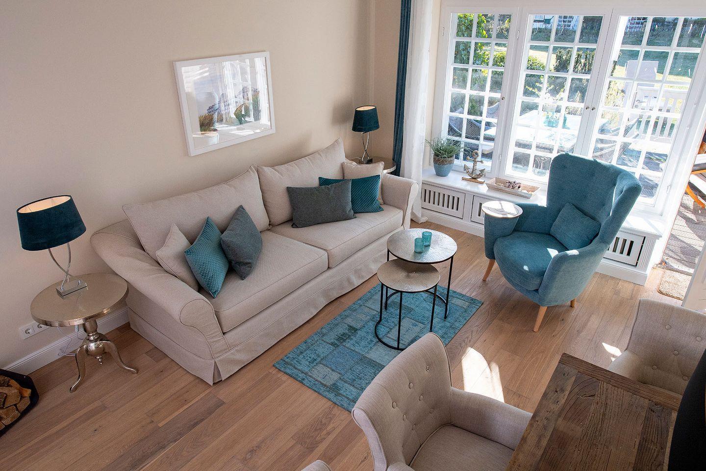 Im lichtdurchfluteten Zentrum des Ferien Domizils erwartet den Bewohner eine in türkis- und blaufarbigen Tönen eingerichtete Wohnlandschaft mit großem Sofa, gemütlichem Lesesessel und einem Kachelofen. Ein großer Esstisch mit gepolsterter Sitzbank und Sesseln bildet den Mittelpunkt des großzügigen Wohn- und Essbereichs. Fast alle Möbel sind von Rivièra Maison. Die offene Küche ist komplett ausgestattet und macht Lust, für oder mit der Familie zu kochen. In den oberen Räumen sorgen maritime Farben mit roten Akzenten für eine sympathische Wohnatmosphäre.