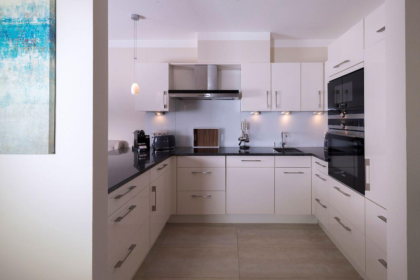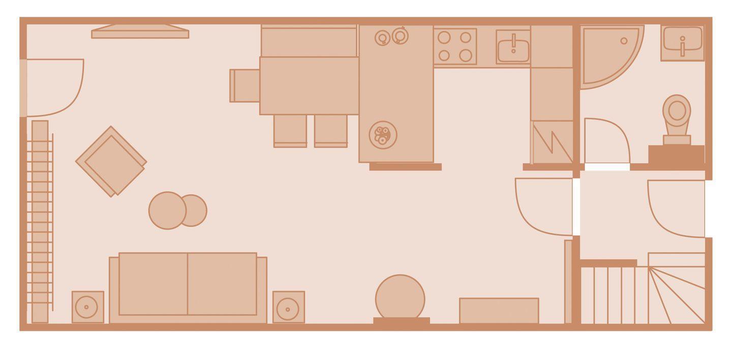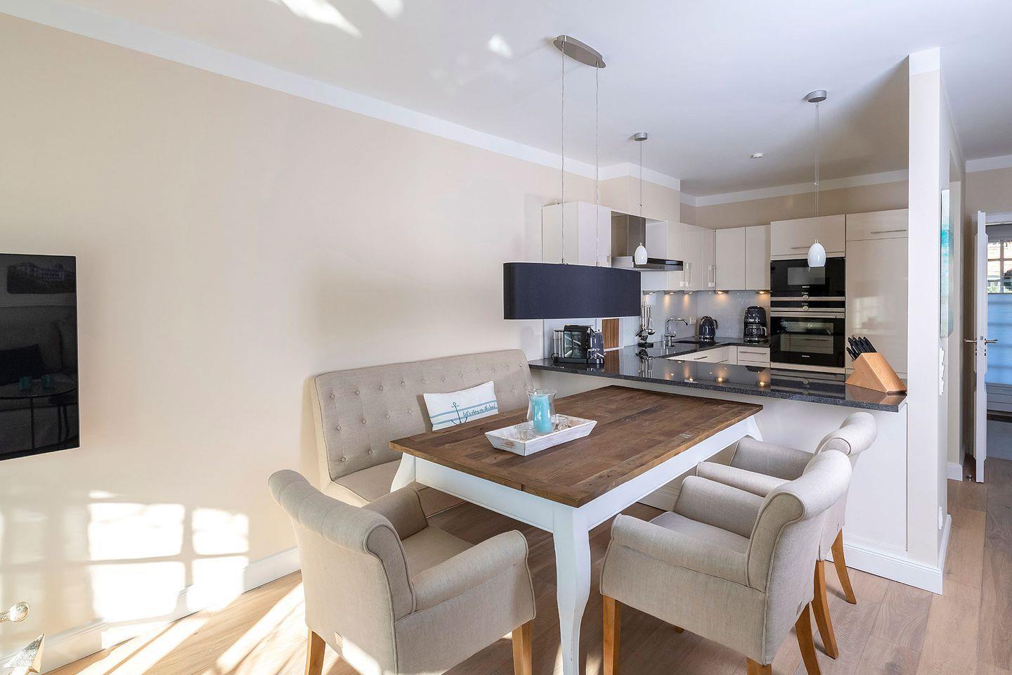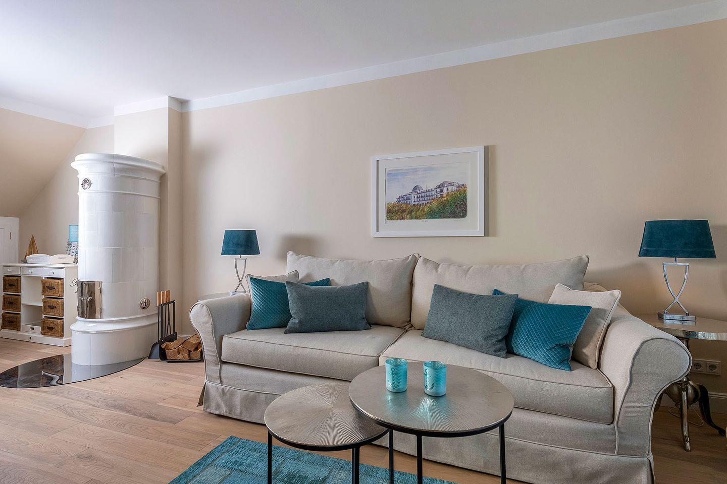 Im lichtdurchfluteten Zentrum des Ferien Domizils erwartet den Bewohner eine in türkis- und blaufarbigen Tönen eingerichtete Wohnlandschaft mit großem Sofa, gemütlichem Lesesessel und einem Kachelofen. Ein großer Esstisch mit gepolsterter Sitzbank und Sesseln bildet den Mittelpunkt des großzügigen Wohn- und Essbereichs. Fast alle Möbel sind von Rivièra Maison. Die offene Küche ist komplett ausgestattet und macht Lust, für oder mit der Familie zu kochen. In den oberen Räumen sorgen maritime Farben mit roten Akzenten für eine sympathische Wohnatmosphäre.