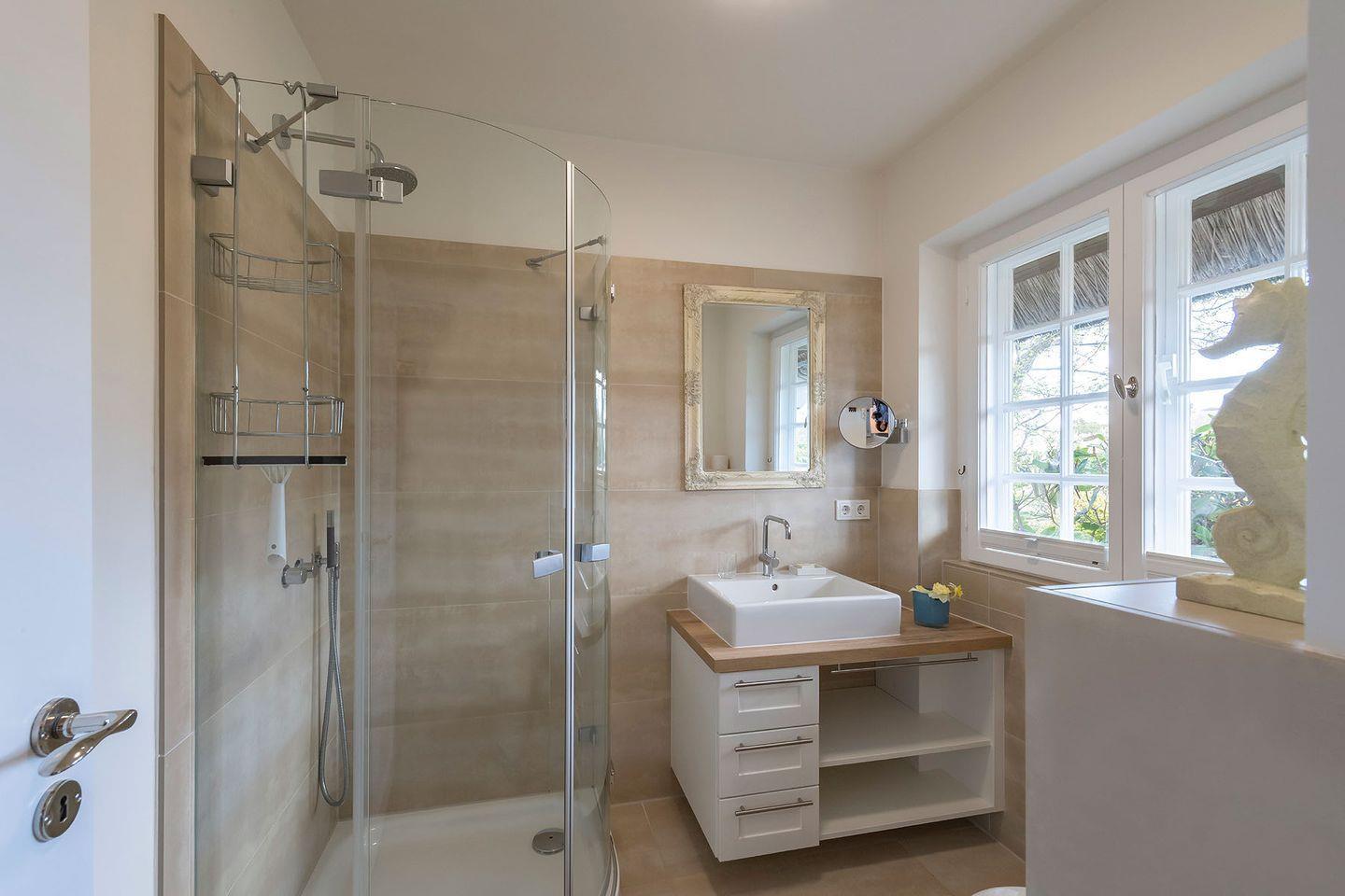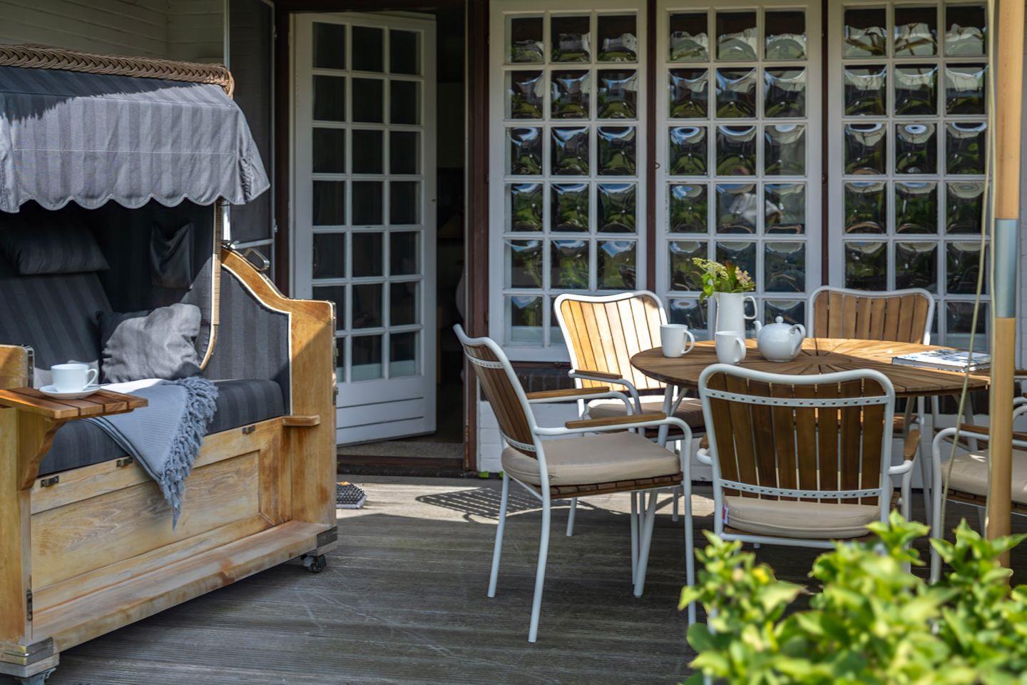 Erdgeschoss: Flur, Gäste-WC mit Dusche, komplett eingerichtete, offene Küche mit Nespresso- und Filterkaffeemaschine, Wohnzimmer mit Kachelofen, Essbereich und TV, großzügiger Garten mit Holzdielen-Südwest Terrasse, Gartenmöbeln und Strandkorb