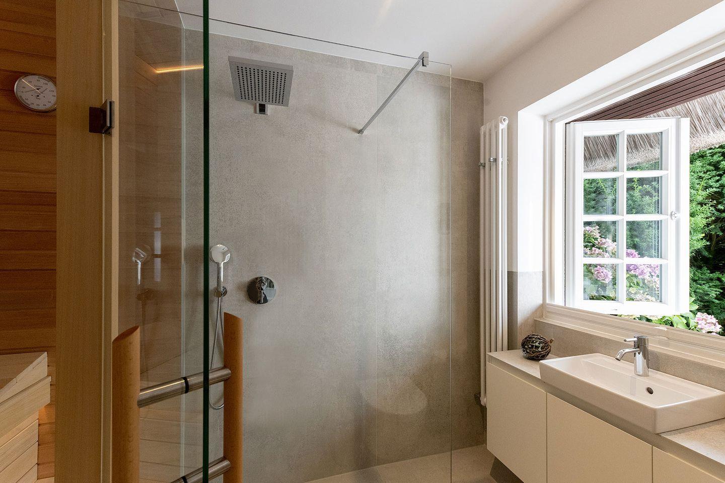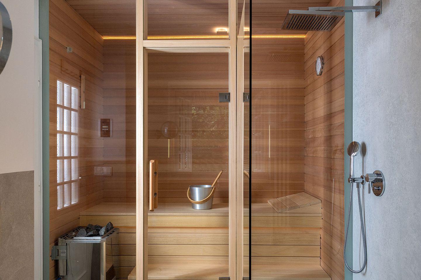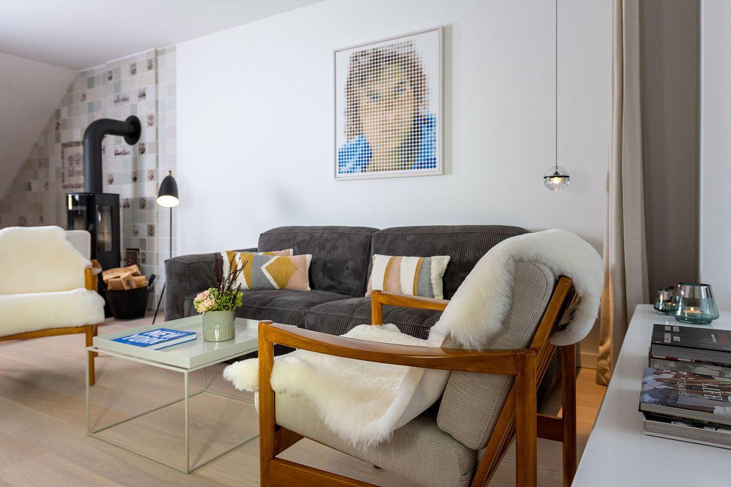 Im offenen Wohn- und Essbereich des Erdgeschosses befindet sich ein sympathisches Ensemble aus gemütlichem Sofa, Vintage-Sesseln und einer runden Essgruppe. Die offene Küche ist mit ihrer modernen Ausstattung ideal geeignet für ein gemeinsames Kochvergnügen. An kalten Tagen spendet ein Kaminofen angenehme Wärme. Nach ausgiebigen Ausflügen auf der Insel bietet eine im modernen Bad des Erdgeschosses integrierte Sauna Raum für wunderbare Wellness-Momente.