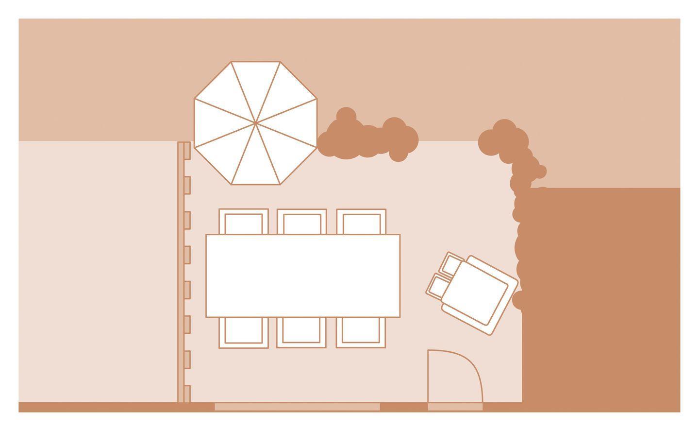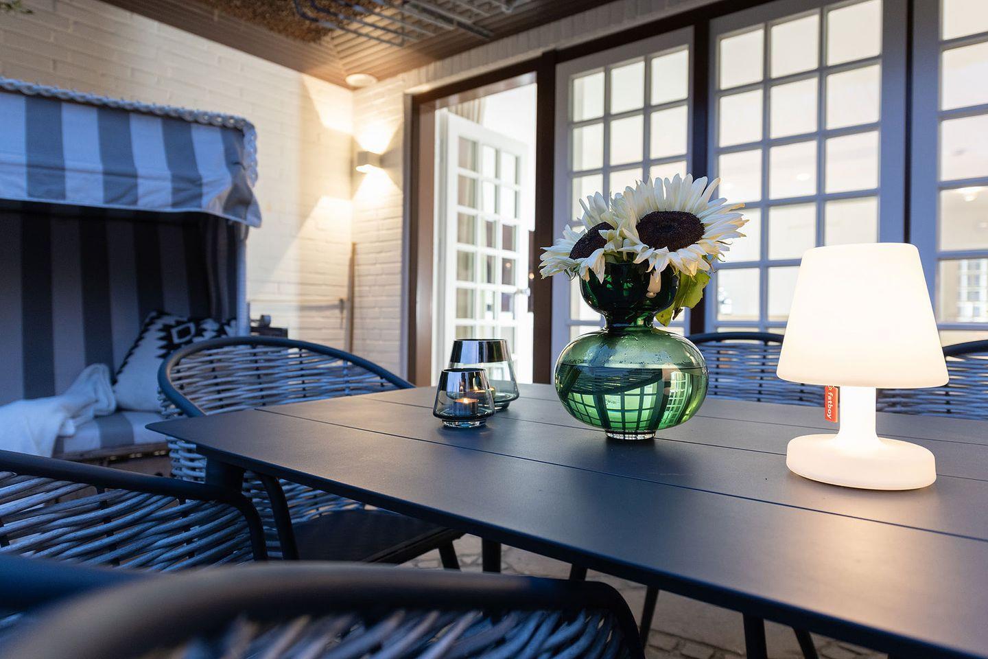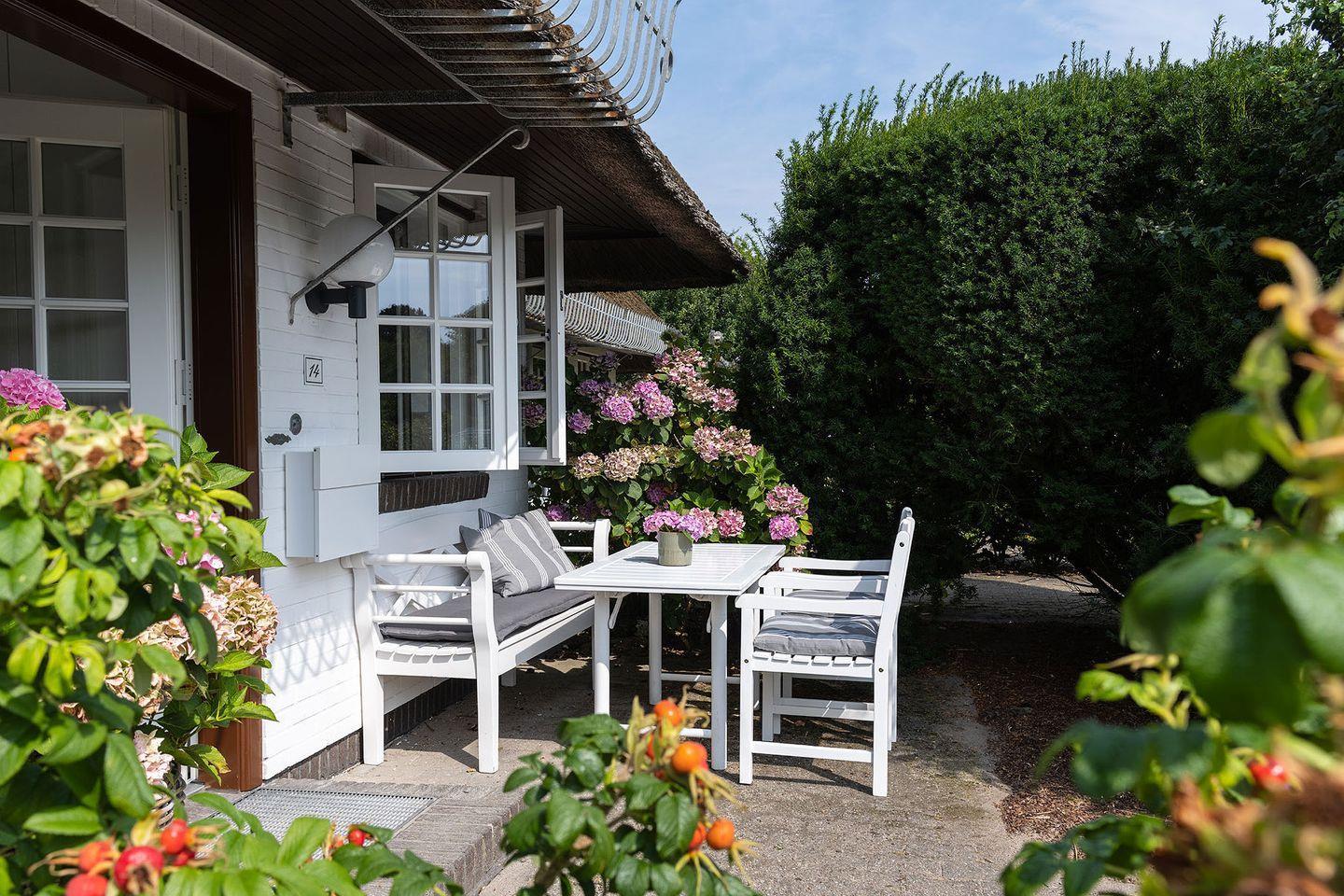 Auf der geschützt liegenden Frühstücks-Terrasse kann man den Tag mit einer Tasse Tee oder frischem Kaffee im Licht der Morgensonne beginnen. Eine zweite nach Westen ausgerichtete und in Naturstein ausgeführte Terrasse öffnet den Wohnbereich zu den Sonnenplätzen im 200 m² großen Garten. Die Terrasse ist ausgestattet mit Gartenmöbeln und einem Strandkorb – ein idealer Platz, um den Tag im warmen Abendlicht mit einen Sundowner in die Nacht zu verabschieden.