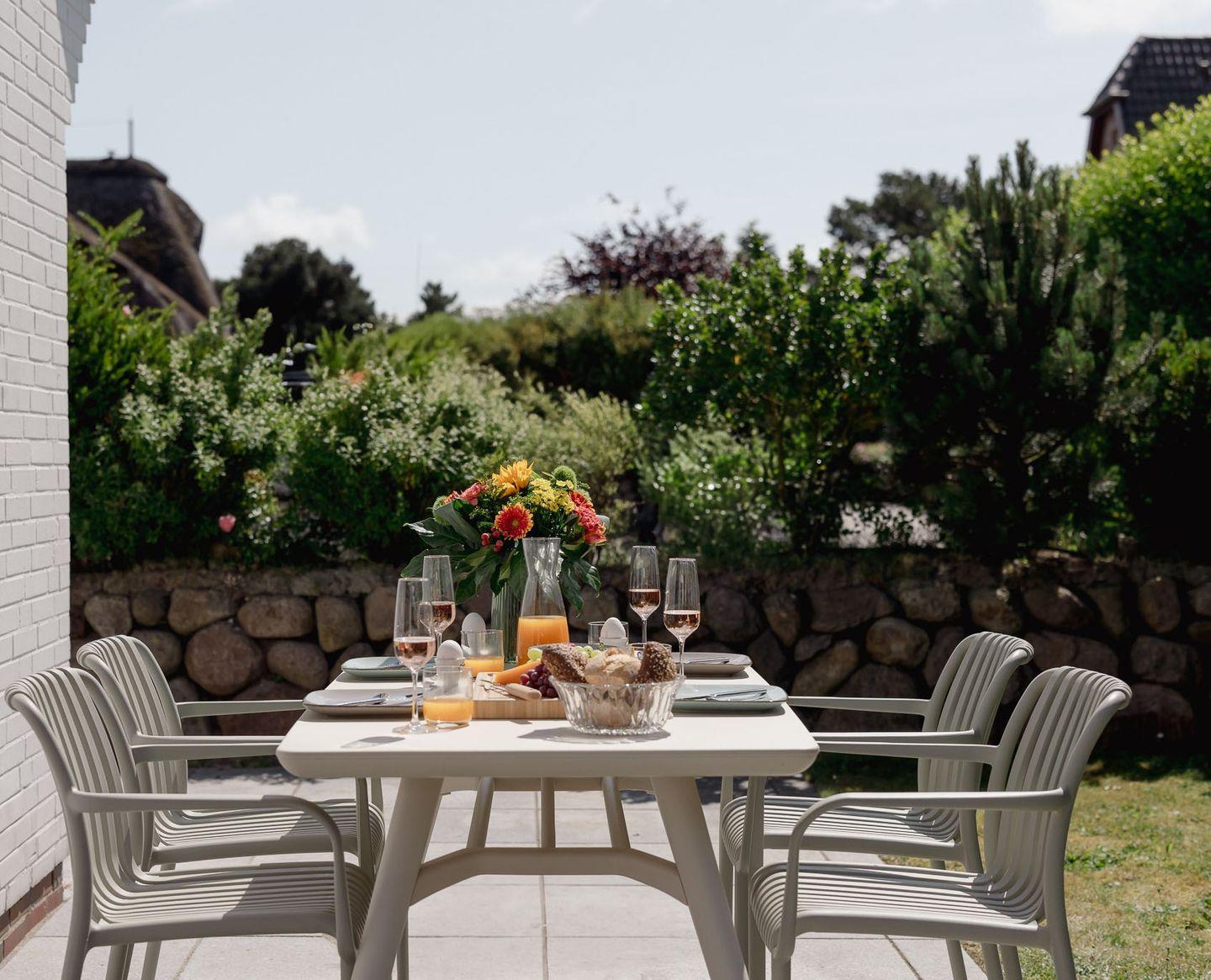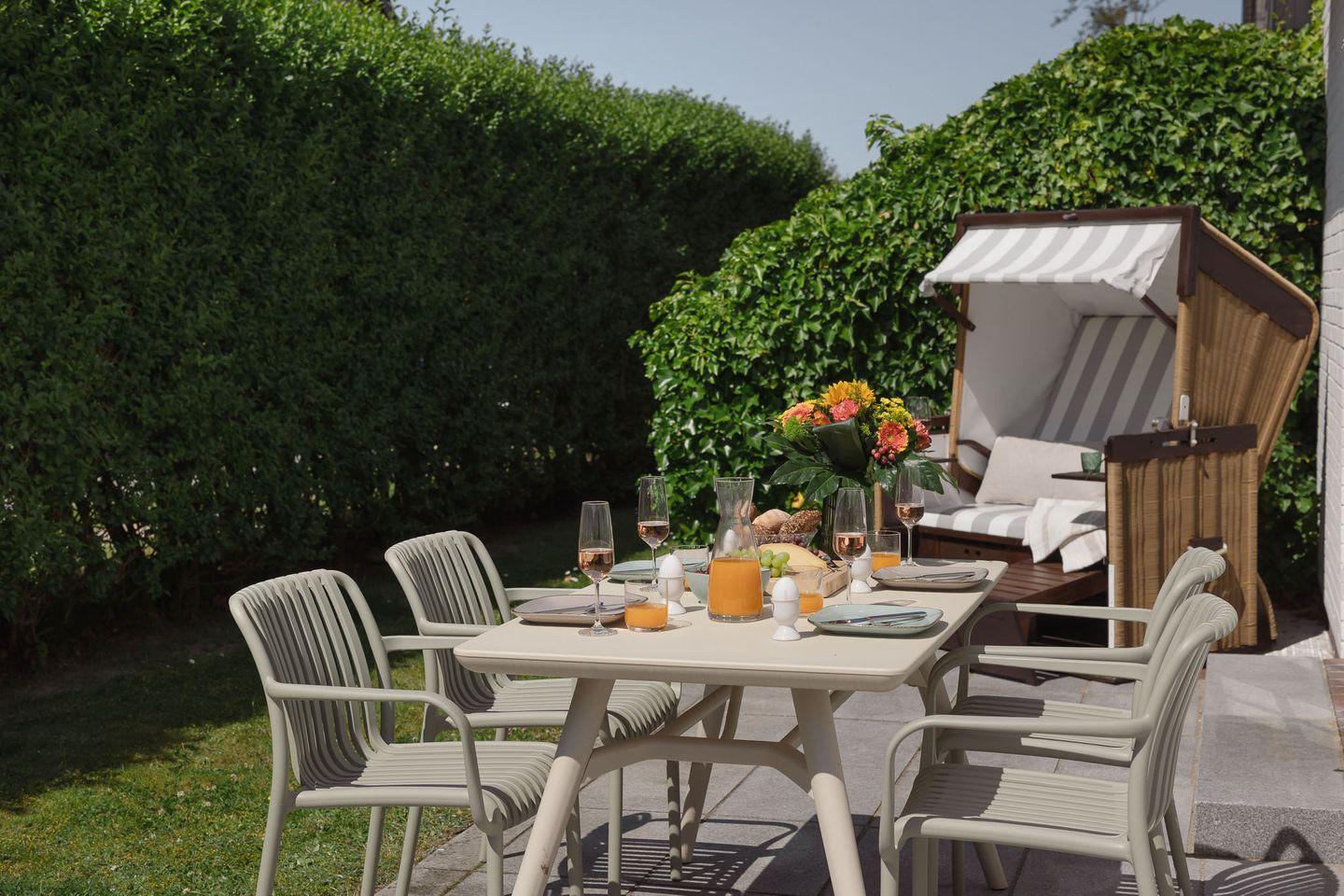 Genießen Sie die sonnigen Stunden auf der südwestlich ausgerichteten Terrasse, die mit eleganten Granitplatten, einem gemütlichen Strandkorb (saisonal), einer elektrischen Markise sowie einem modernen Tisch und vier bequemen Stühlen ausgestattet ist. Der angrenzende Garten bietet ausreichend Platz für entspannte Stunden im Grünen – auch für Ihren vierbeinigen Freund, denn im "Baileys Hüs" sind Hunde herzlich willkommen! Für sie gibt es sogar einen speziellen "Hundeleineparkplatz".