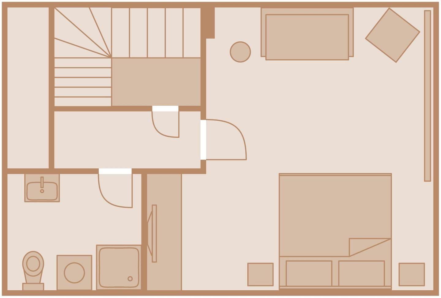 Obergeschoss: 1 Doppelzimmer mit TV, Badezimmer mit Badewanne und WC