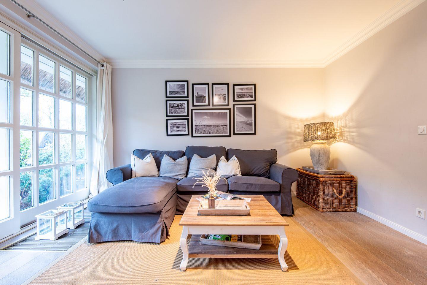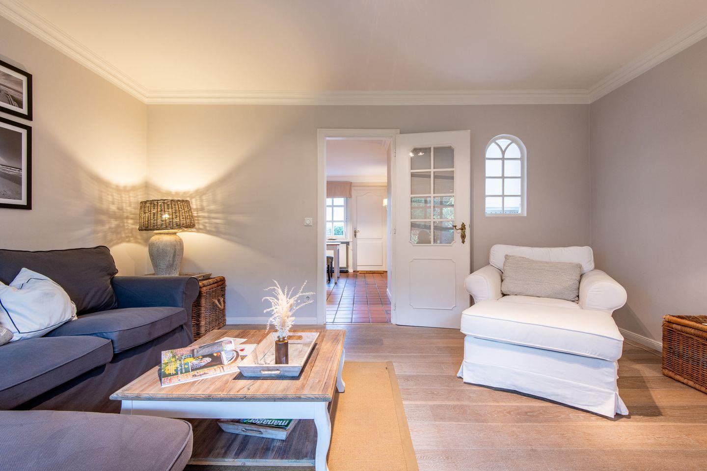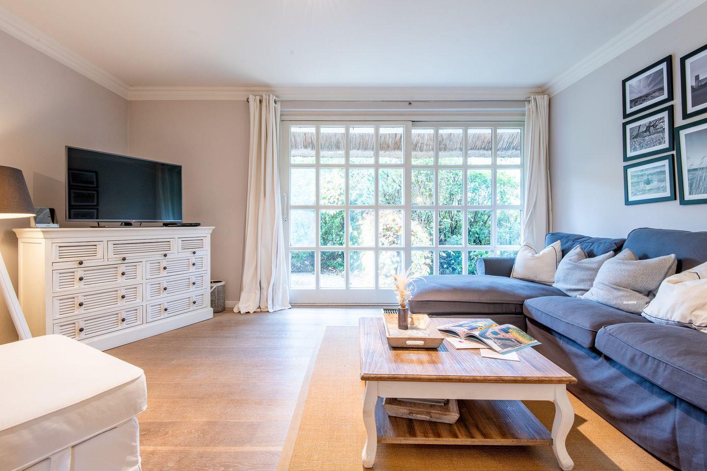 Der lichtdurchflutete Wohnbereich lädt mit einer stilvollen und gemütlichen Einrichtung zum Entspannen ein. Hier können Sie nach einem ausgiebigen Spaziergang am Wattenmeer auf dem Sofa oder im großen Sessel entspannen und Ihre Lieblingsserien über das internetfähige TV genießen. Der direkte Zugang zur möblierten Westterrasse mit Strandkorb ermöglicht es Ihnen, die Sonne und die friesische Brise in vollen Zügen zu genießen.