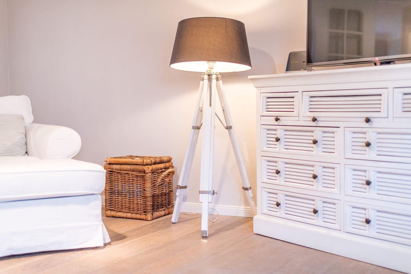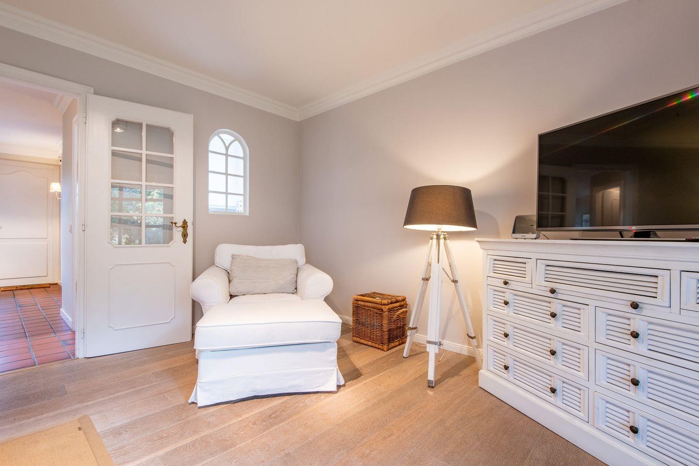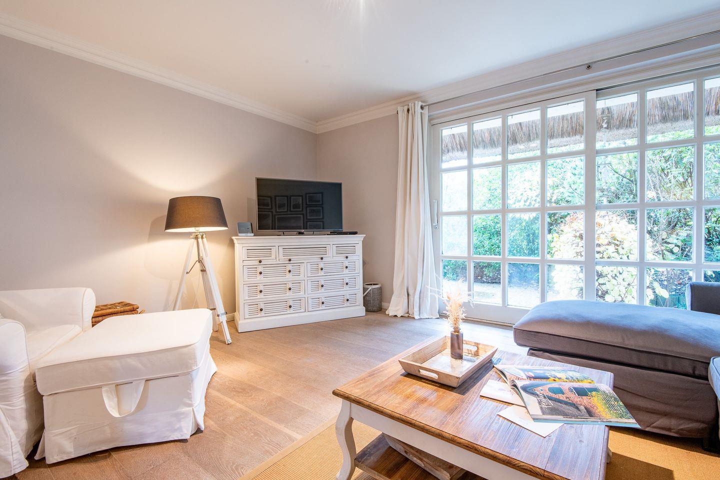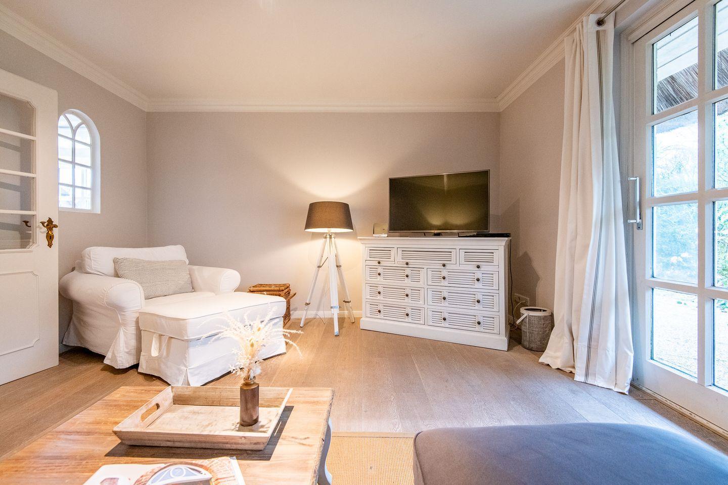 Der lichtdurchflutete Wohnbereich lädt mit einer stilvollen und gemütlichen Einrichtung zum Entspannen ein. Hier können Sie nach einem ausgiebigen Spaziergang am Wattenmeer auf dem Sofa oder im großen Sessel entspannen und Ihre Lieblingsserien über das internetfähige TV genießen. Der direkte Zugang zur möblierten Westterrasse mit Strandkorb ermöglicht es Ihnen, die Sonne und die friesische Brise in vollen Zügen zu genießen.