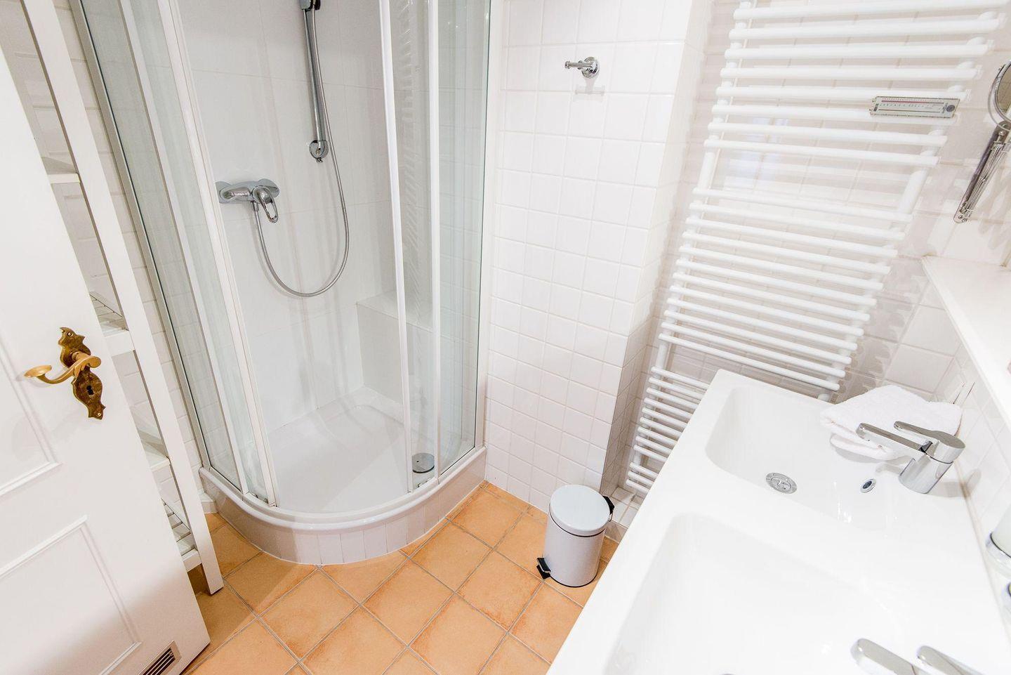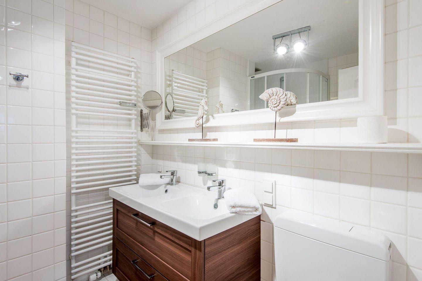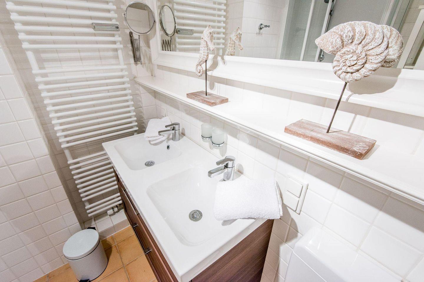 Das moderne Badezimmer verfügt über eine große Dusche, WC, Doppelwaschbecken, Handtuchwärmer und Fön und sorgt für einen komfortablen Start in den Tag. Ein Gäste-WC befindet sich im Eingangsbereich und bietet zusätzlichen Komfort.