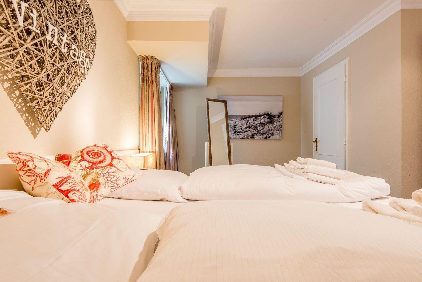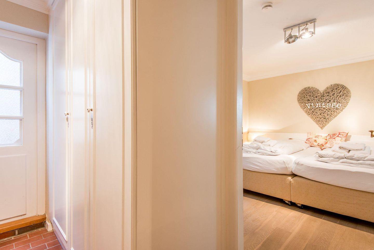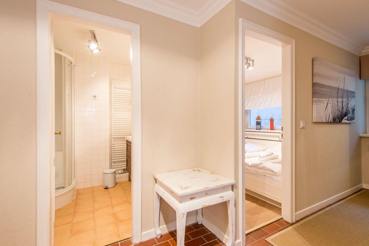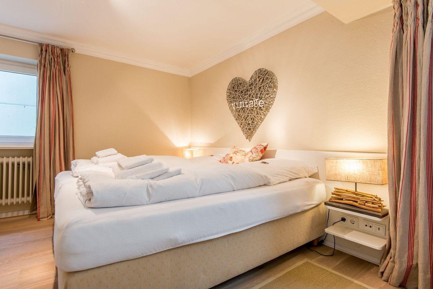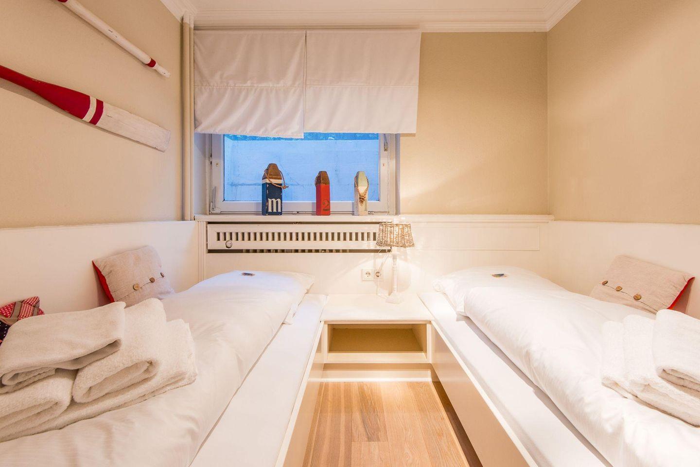 Die zwei Schlafzimmer sind gemütlich und liebevoll eingerichtet. Das Hauptschlafzimmer bietet ein großzügiges Doppelbett (2x 100x200 cm), eine Kommode und eine Ankleidekammer, die ausreichend Stauraum bietet. Das zweite Schlafzimmer ist mit zwei Einzelbetten (je 90x190 cm) ausgestattet und in maritimem Stil dekoriert, sodass das echte Sylt-Gefühl aufkommt.