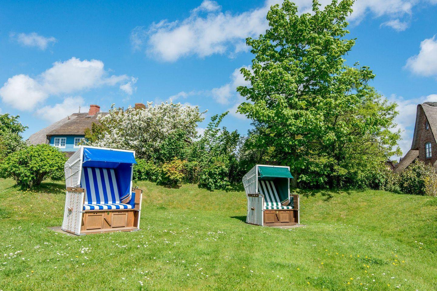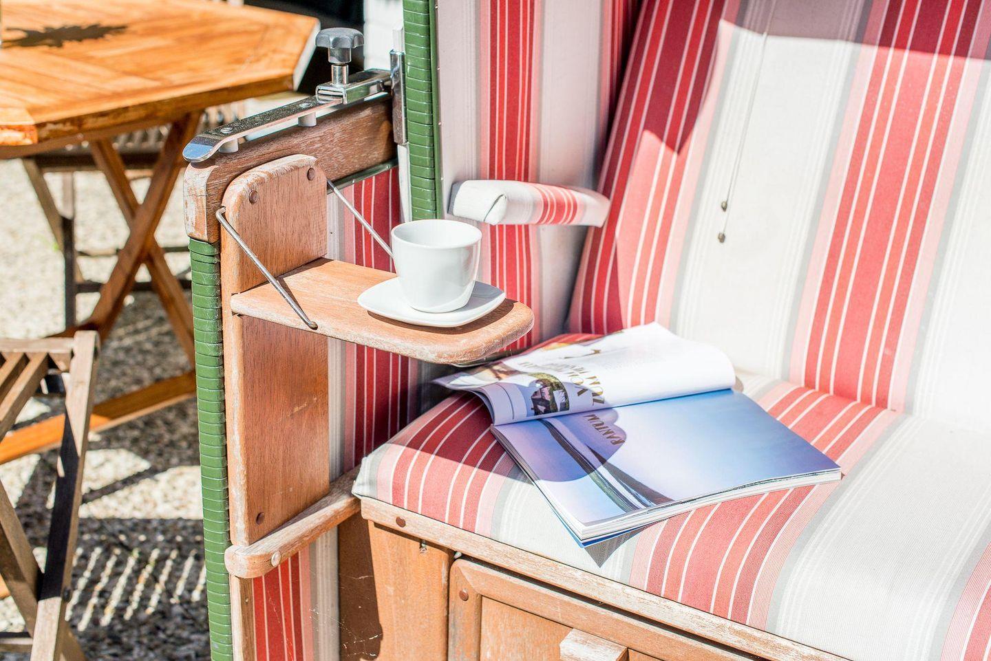 Genießen Sie die Ruhe der umliegenden Natur auf der möblierten Terrasse mit Westausrichtung. Die Terrasse ist mit einem Strandkorb ausgestattet und bietet den idealen Platz, um nach einem Tag auf der Insel zu entspannen und die Abendsonne zu genießen.