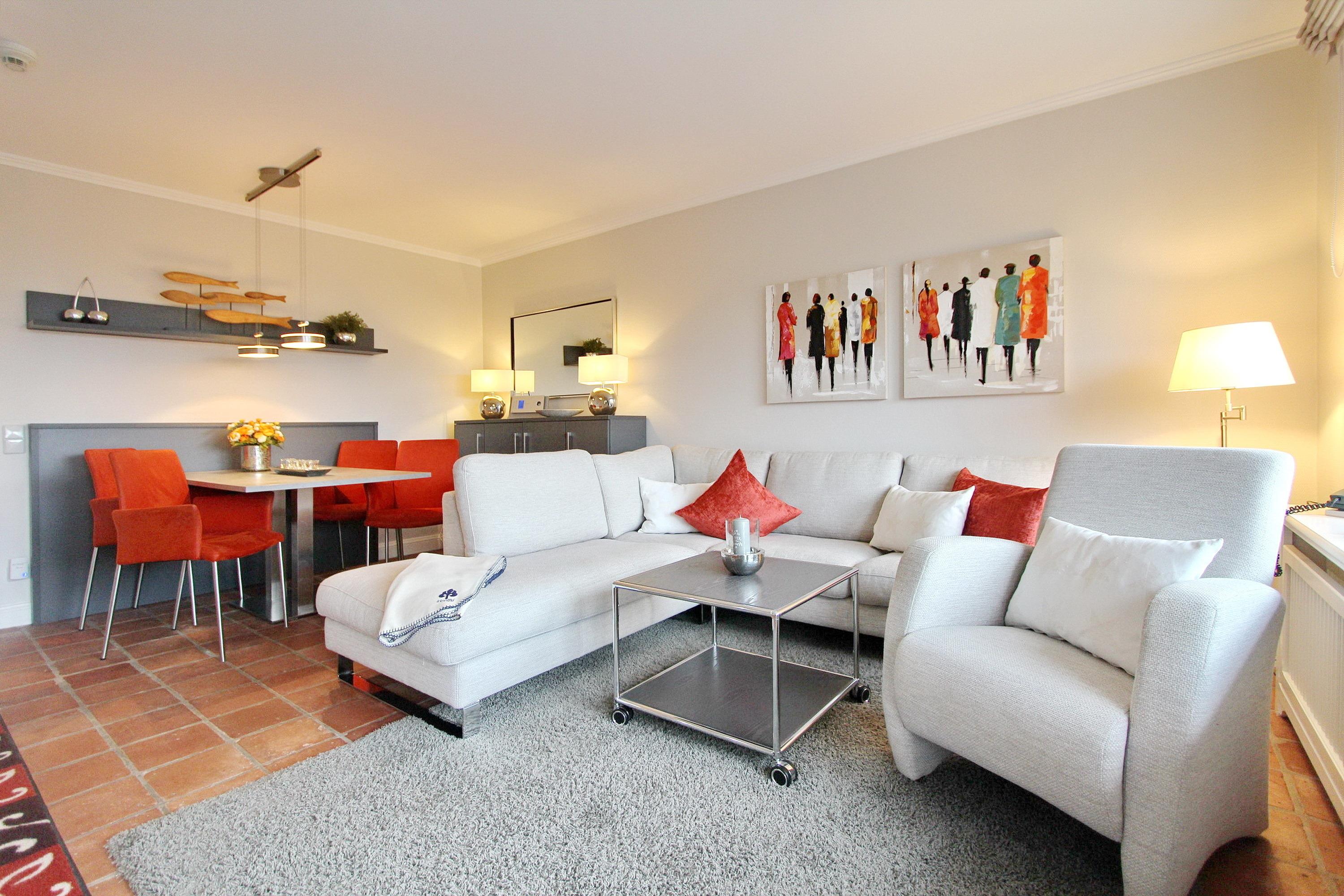 Wohn-/Essbereich: großzügiger Wohnraum mit gemütlicher Eck-Couchgarnitur und Sessel, Esstischgruppe mit 4 Stühlen, TV