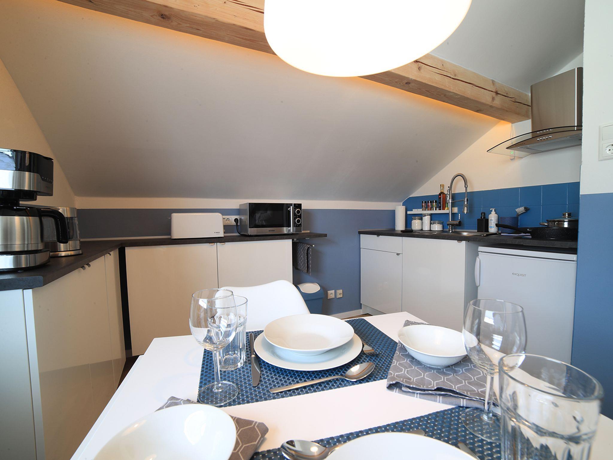Hinweis: Personen über 1,85 m Körpergröße haben in der Küche (Spüle, Hängeschränke), in der Snoezelen-Lounge und im Schlafbereich aufgrund der Dachschräge evtl. Komforteinbußen.