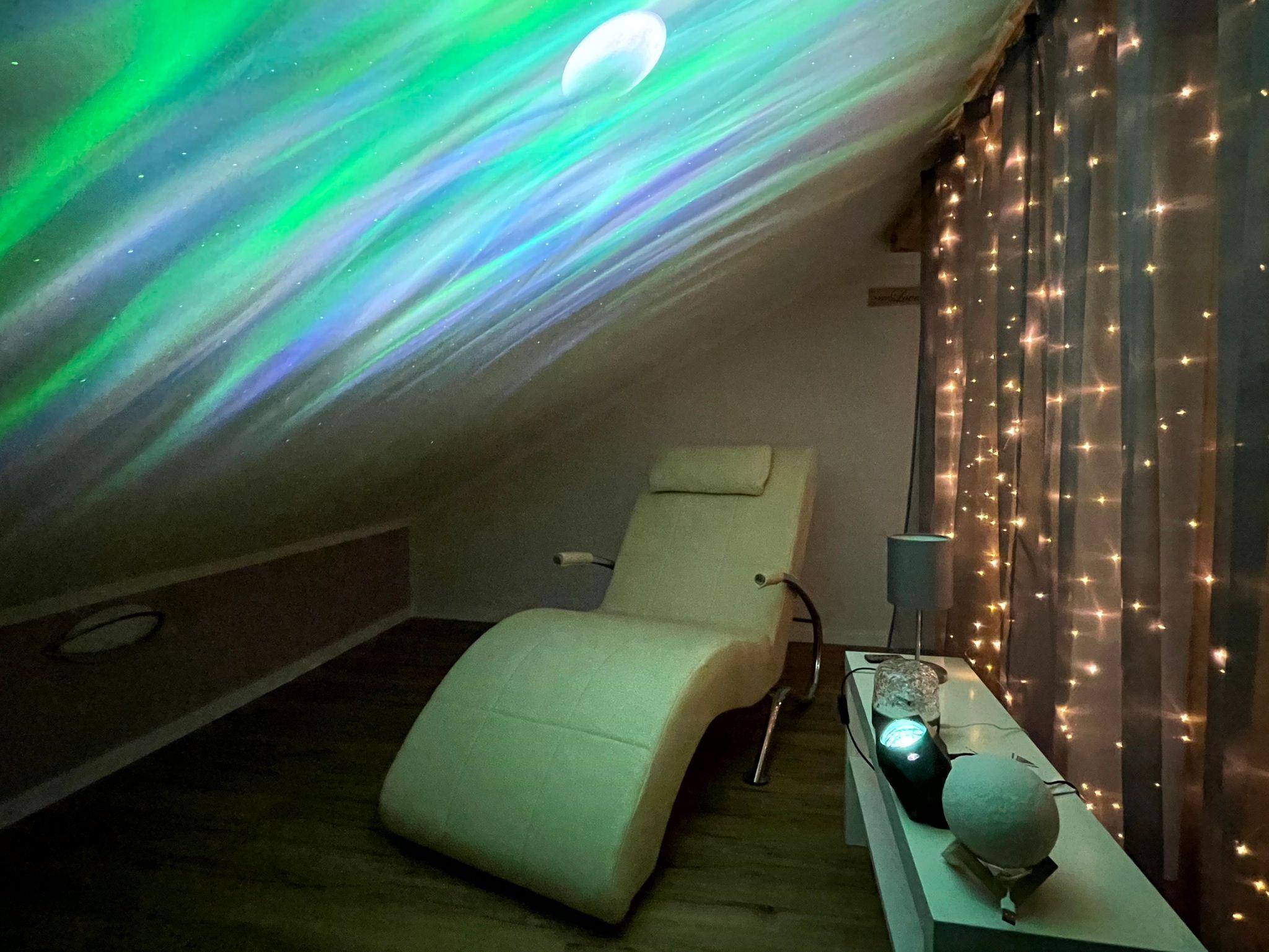 Wohnbereich: 2- und 3-Sitzer-Ledercouch, 50 Zoll-Fernseher, Snoezelen-Bereich mit Relaxliege, große Kommode und 2 Kleiderschränke