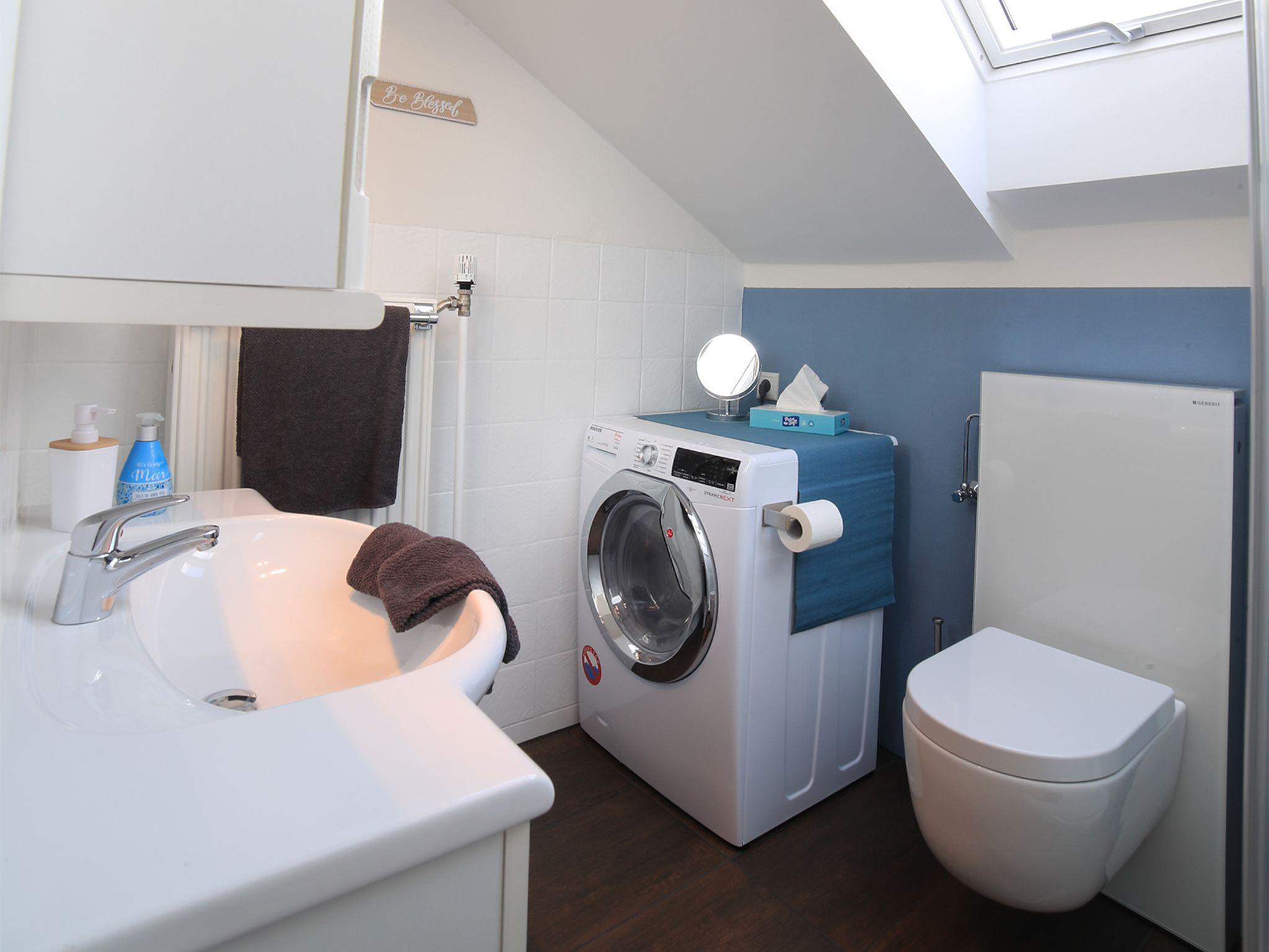 Bad: verglaste Dusche, Tiefspül-WC, Waschbecken mit Spiegelschrank, Waschtrockner, Vergrößerungsspiegel
