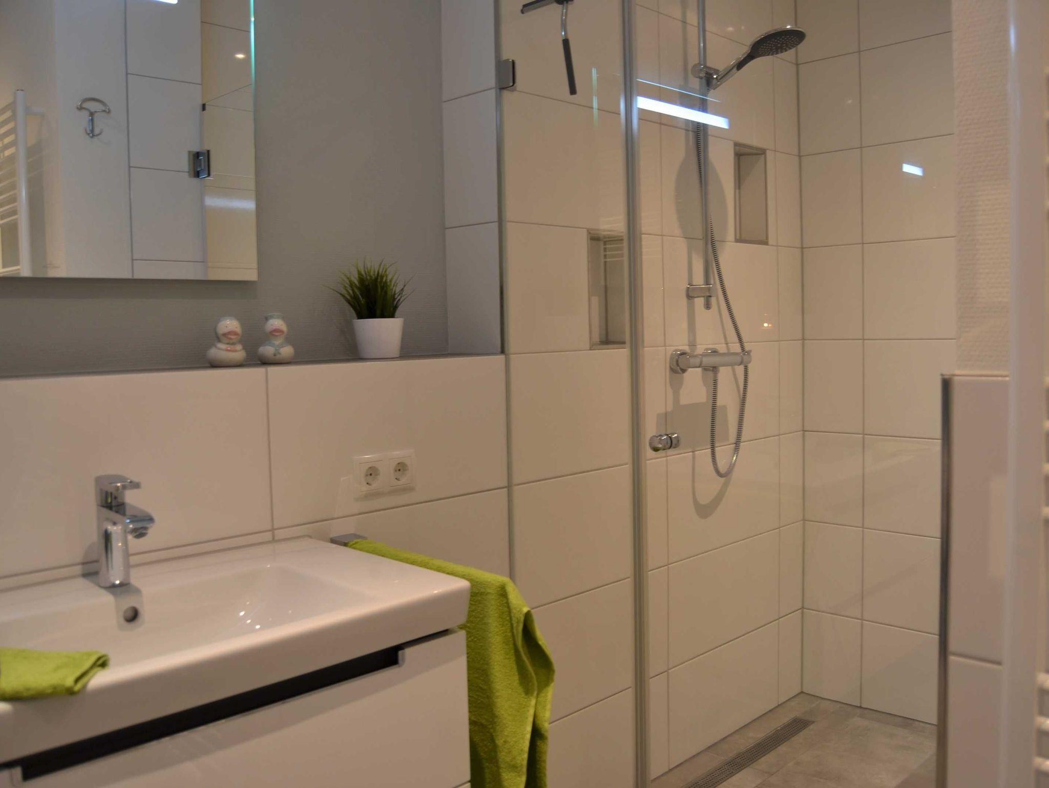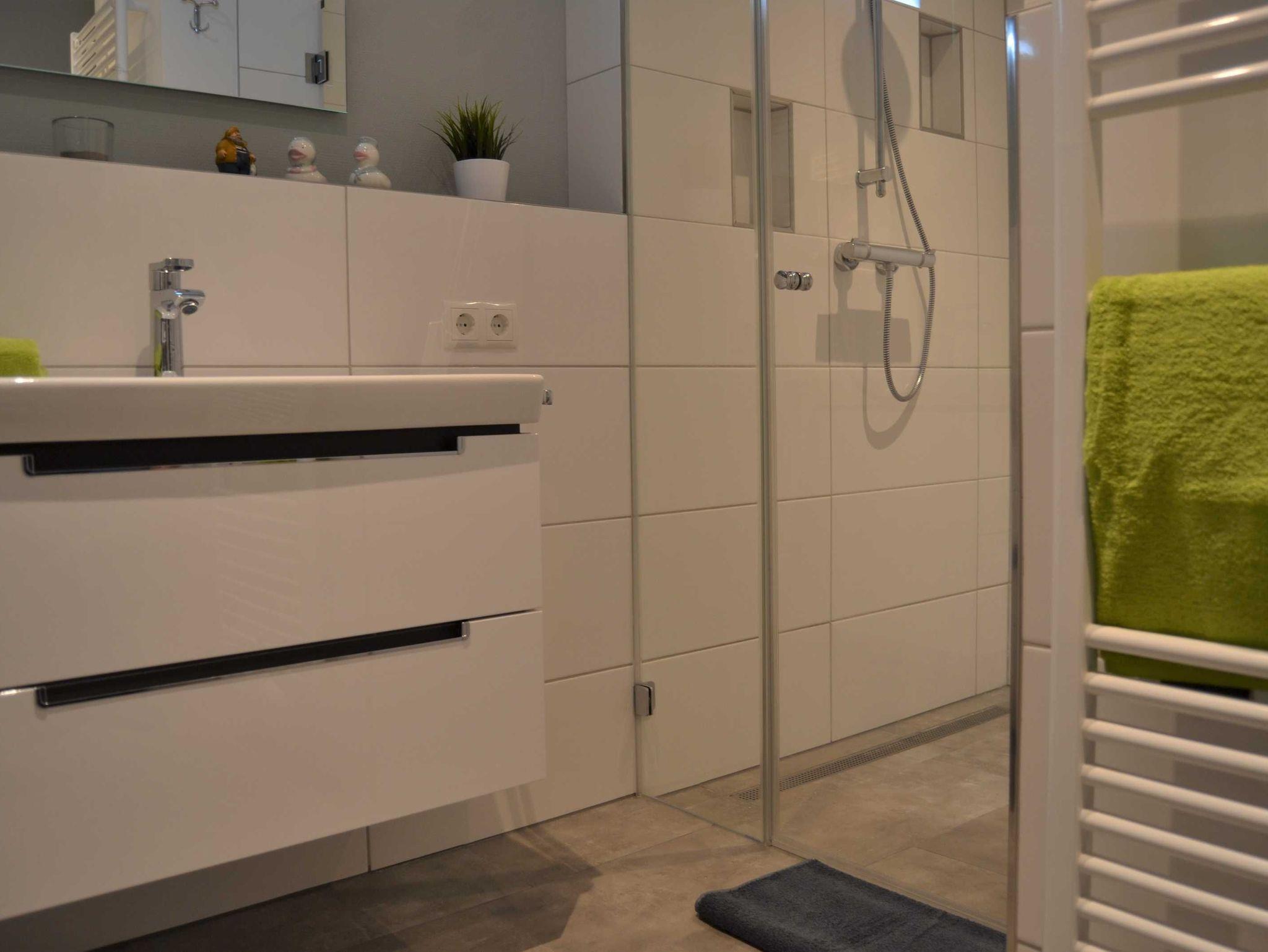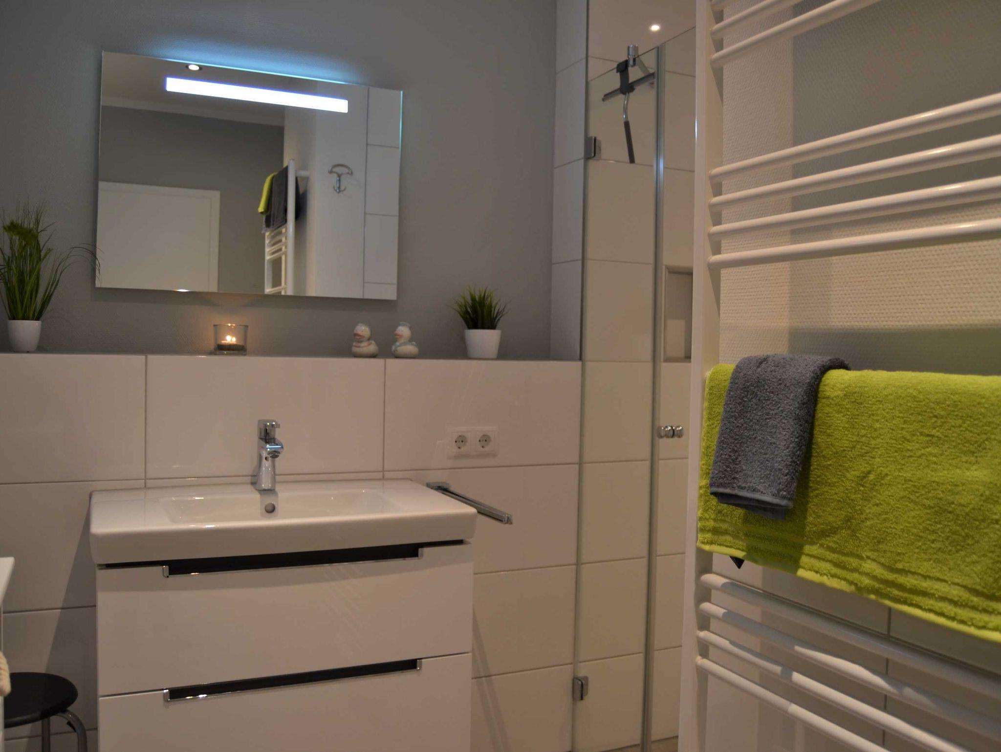 Großzügige Ablageflächen sind im Bad sowie in der Dusche vorhanden. Zur Ausstattung gehören selbstverständlich ein Handtuchheizkörper sowie ein Föhn.