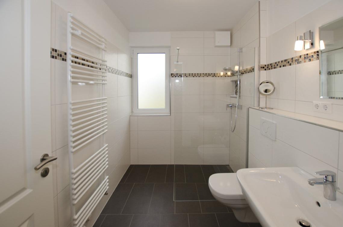 Das Badezimmer mit Fußbodenheizung und Handtuchwärmer hat eine geräumige Dusche, WC, ein eingebautes Bad-Radio sowie ein Außenfenster.