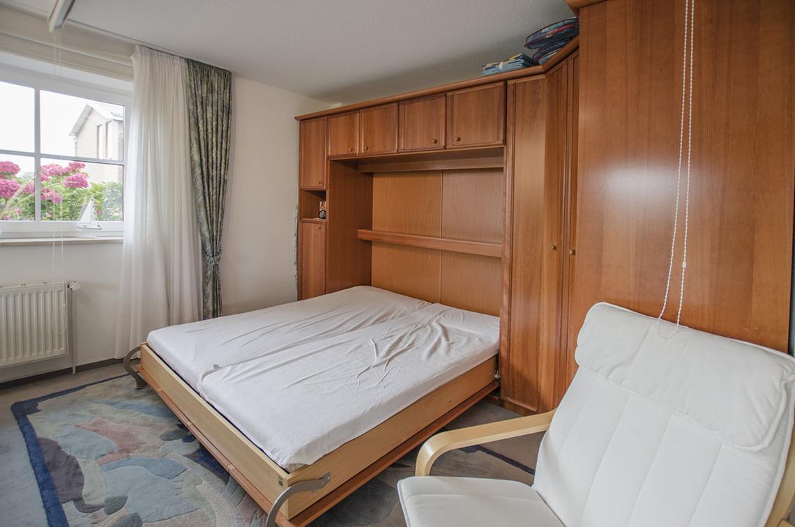 Das Wohnschlafzimmer ist mit einem Schrankbett, einer 2er Couch und Sessel sowie einem Esstisch mit 4 Stühlen ausgestattet und verfügt über Zugang zur möblierten Terrasse.
